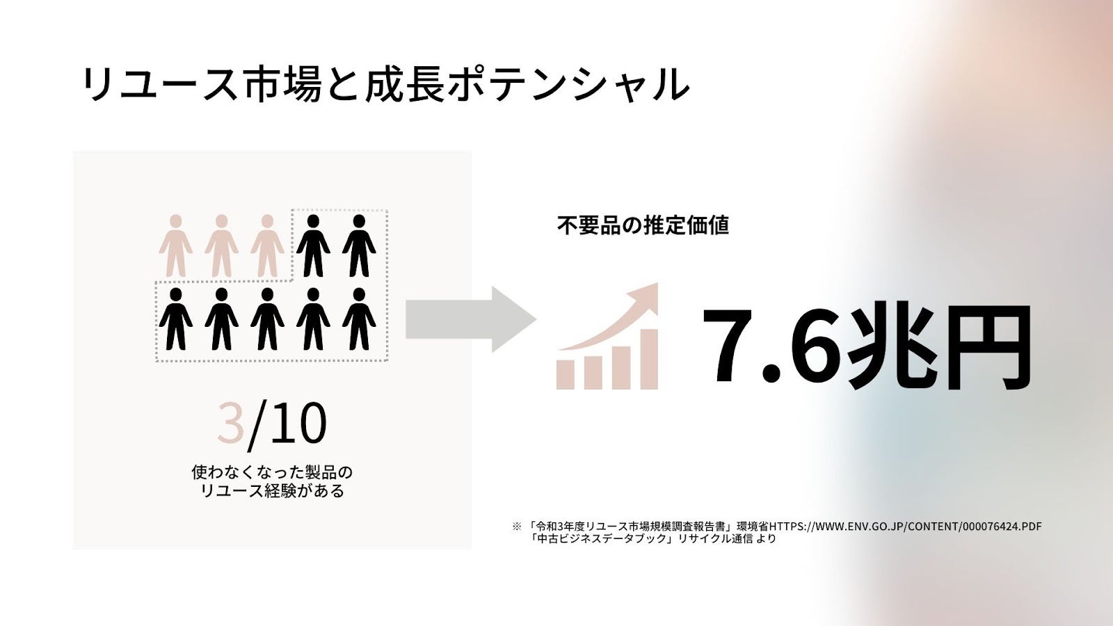 日本のリユース市場は、年間約2.7兆円といわれていますが、日本におけるリユース経験者は約3割に留まっています。リユース経験のない約7割の人たちからも不要品を回収し、循環させることができれば、リユース市場は年間で約7.6兆円まで拡大の余地があるという予測があります。※