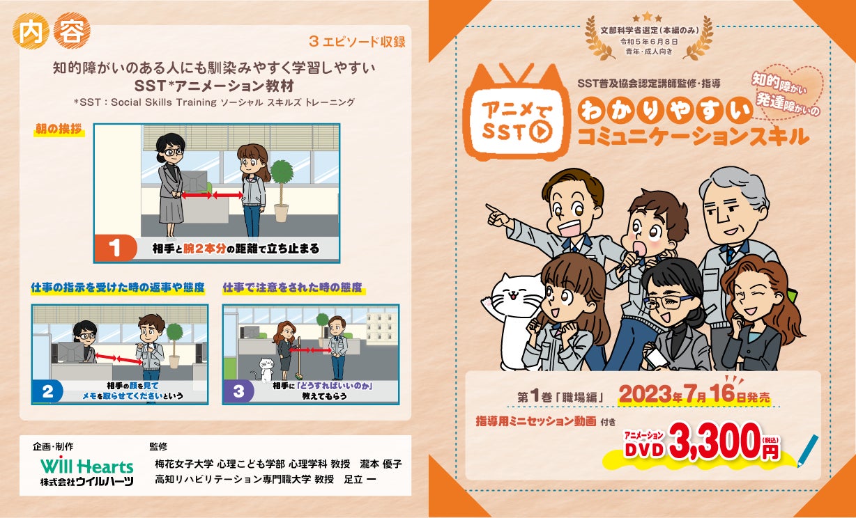 この度発売する教育動画(DVD)は、SST普及協会認定講師の梅花女子大学 瀧本優子教授と高知リハビリテーション専門職大学 足立一教授に監修いただくとともに、ウイルハーツで働く、障がいのある社員が実際にアニメ制作からレコーディングに至るコンテンツ制作に携わるなど、障がいのある方でも馴染みやすく学習しやすいアニメ教材となっております。