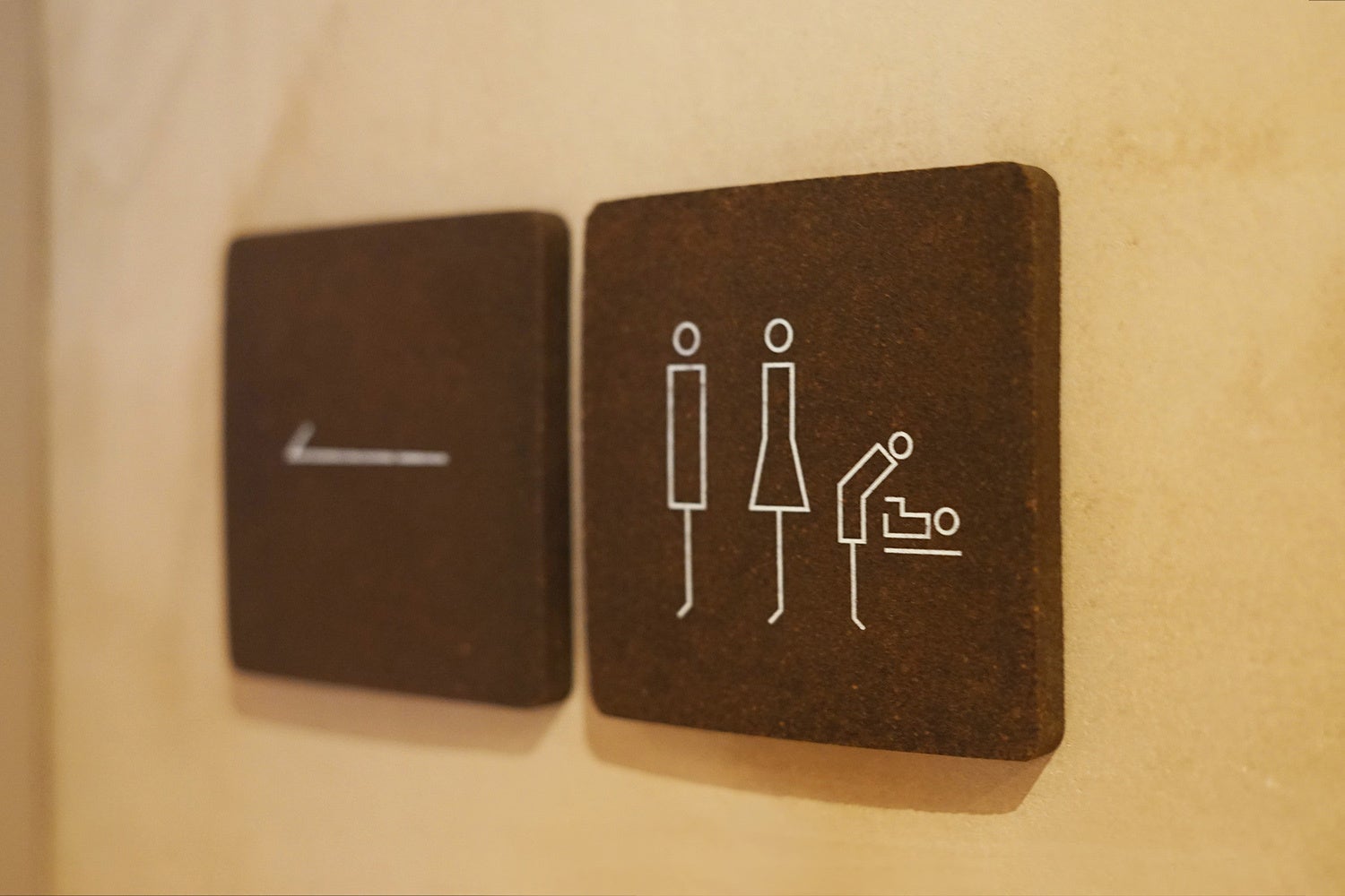 東大発ベンチャーfabula株式会社と共同で開発したコーヒータイル。熱圧縮成型という技術で、規格外となったコーヒー豆の色や香りが残ったまま強固な新素材を生み出しました。廃棄食材の新たな利用法を模索する中で生まれたこのタイルは、ほんのりコーヒーの香りがするトイレのサインボードとして使用されています。