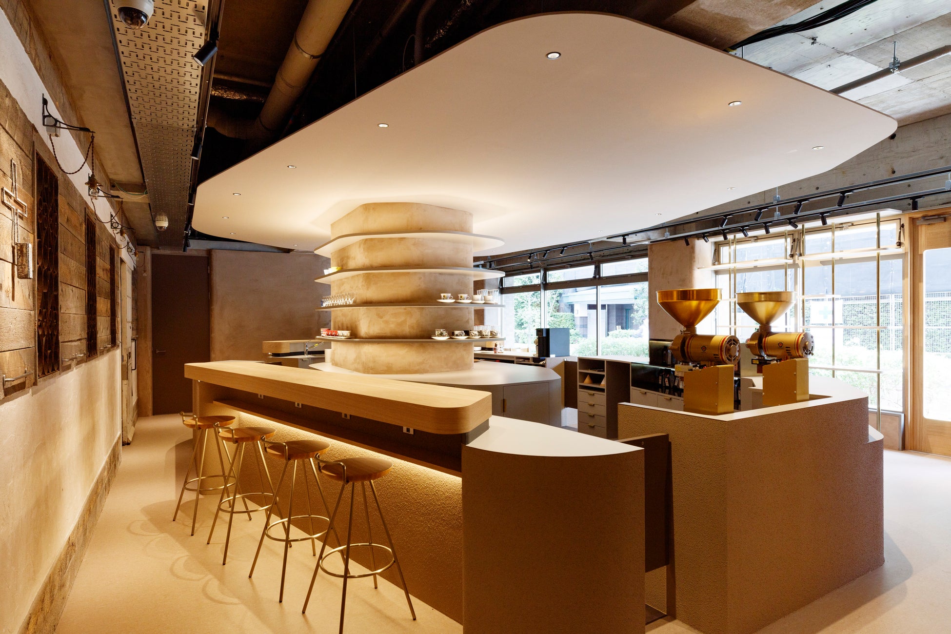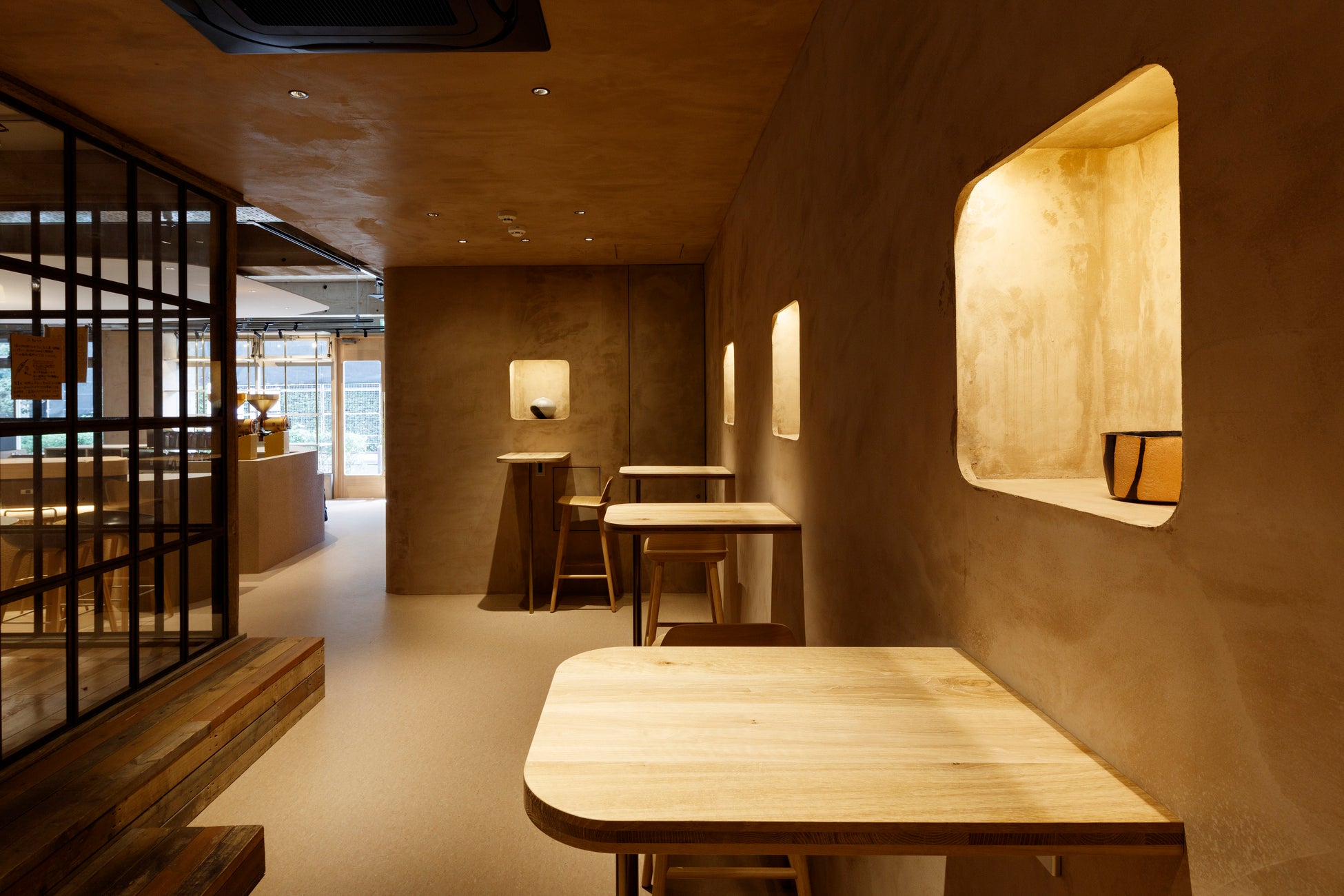 カウンター全周の塗材は経年変化によって塗膜が剥がれ、徐々にコーヒー豆が露出していきます。その肌触りや色合いの変化は、スタッフとお客様とのコミュニケーションの痕跡として刻まれていきます。 コーヒータイルをはじめ、土壁やリノリウム・真鍮など、狛江店で使った特徴的な素材に共通するのは、自然由来であり、そのもの自体の色彩が豊かで、時間と共に表情を変える物性を持つこと。こうして色や形・質感・香りが移ろいながら空間体験ができることを目指しました。