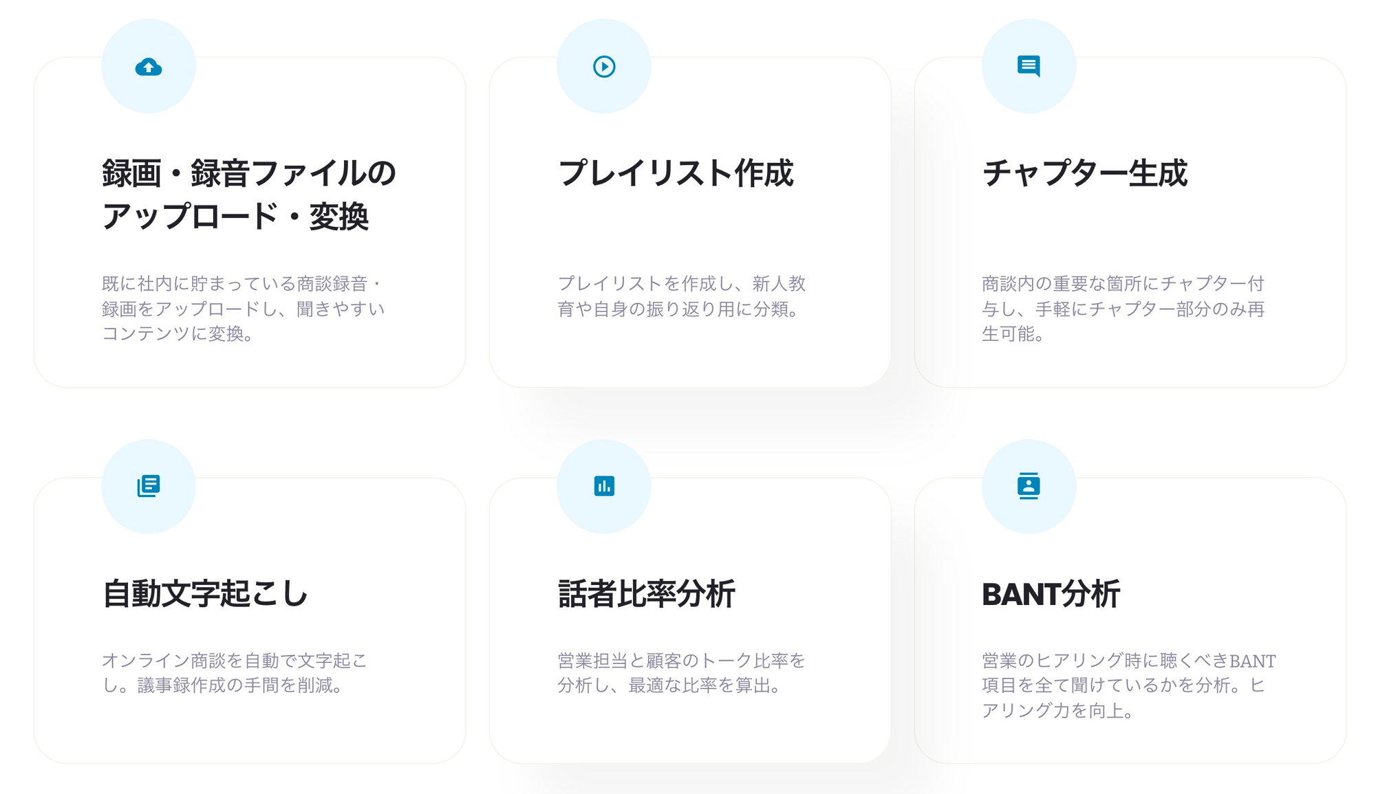 これまでブラックボックスになっていた商談を録音・分析し、忙しいプレイングマネージャーや営業推進部でも視聴・フィードバックしやすい状態に変換します。