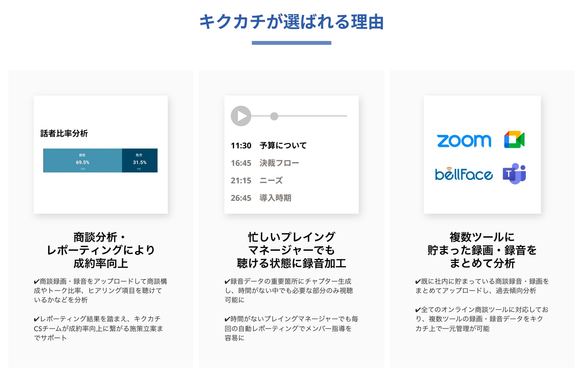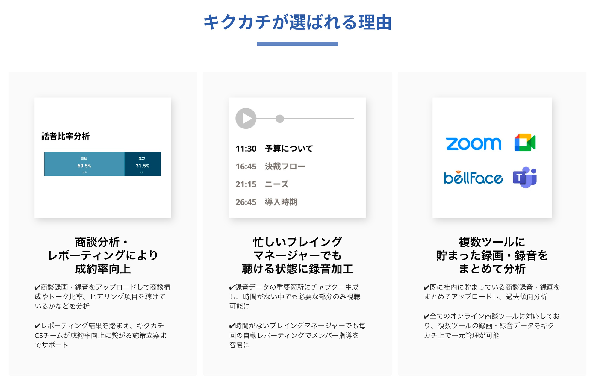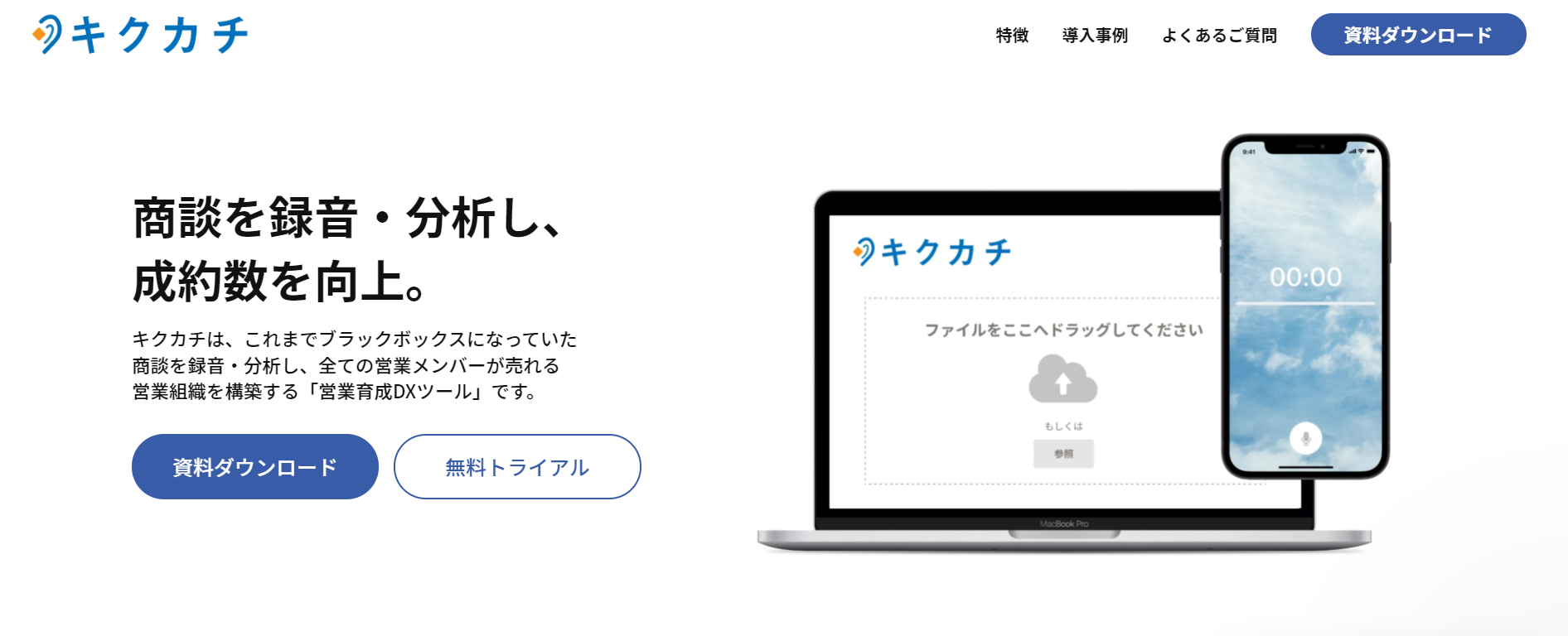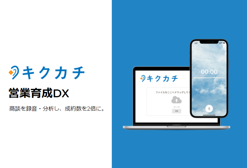「キクカチ」はこれまでブラックボックスになっていた商談を録音・分析し、全ての営業メンバーが売れる営業組織を構築する「営業育成DXツール」です。
