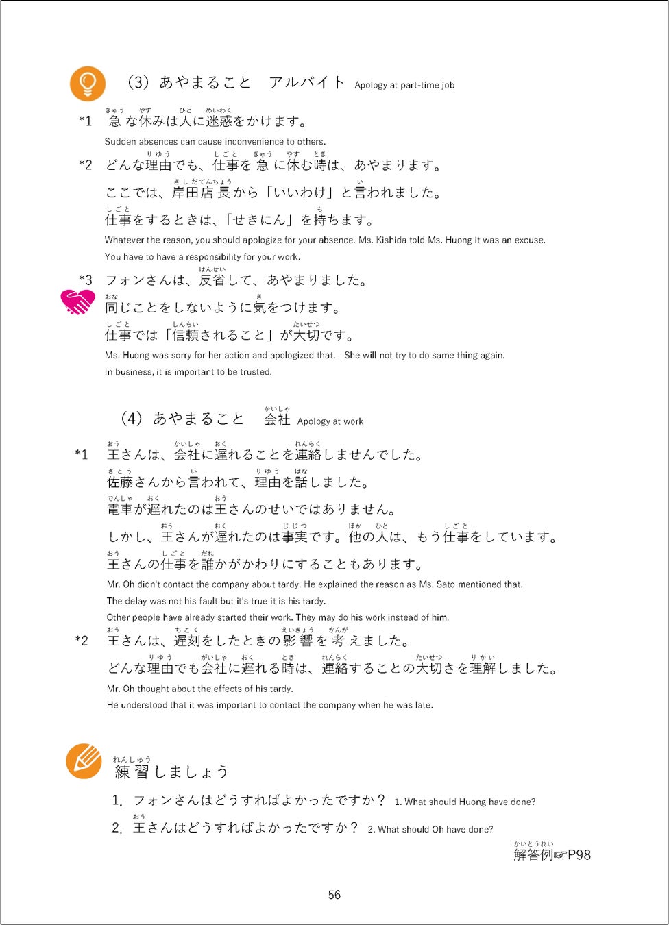 外国人材がアルバイトする場面、会社で働く場面が登場。面接から初出勤、自己紹介、お客様の対応、職場でのコミュニケーション、電話対応など様々なシーンを設定しています。