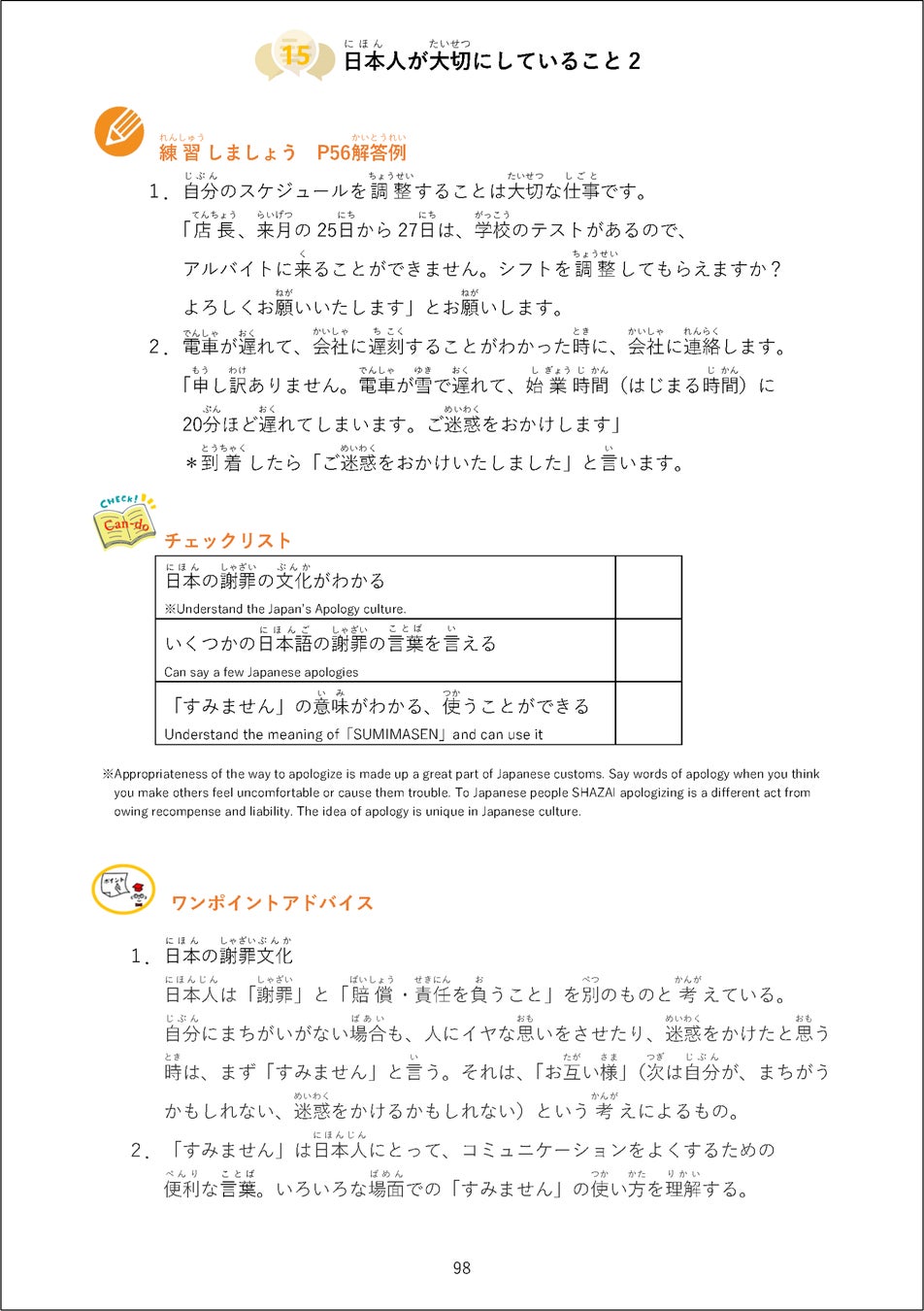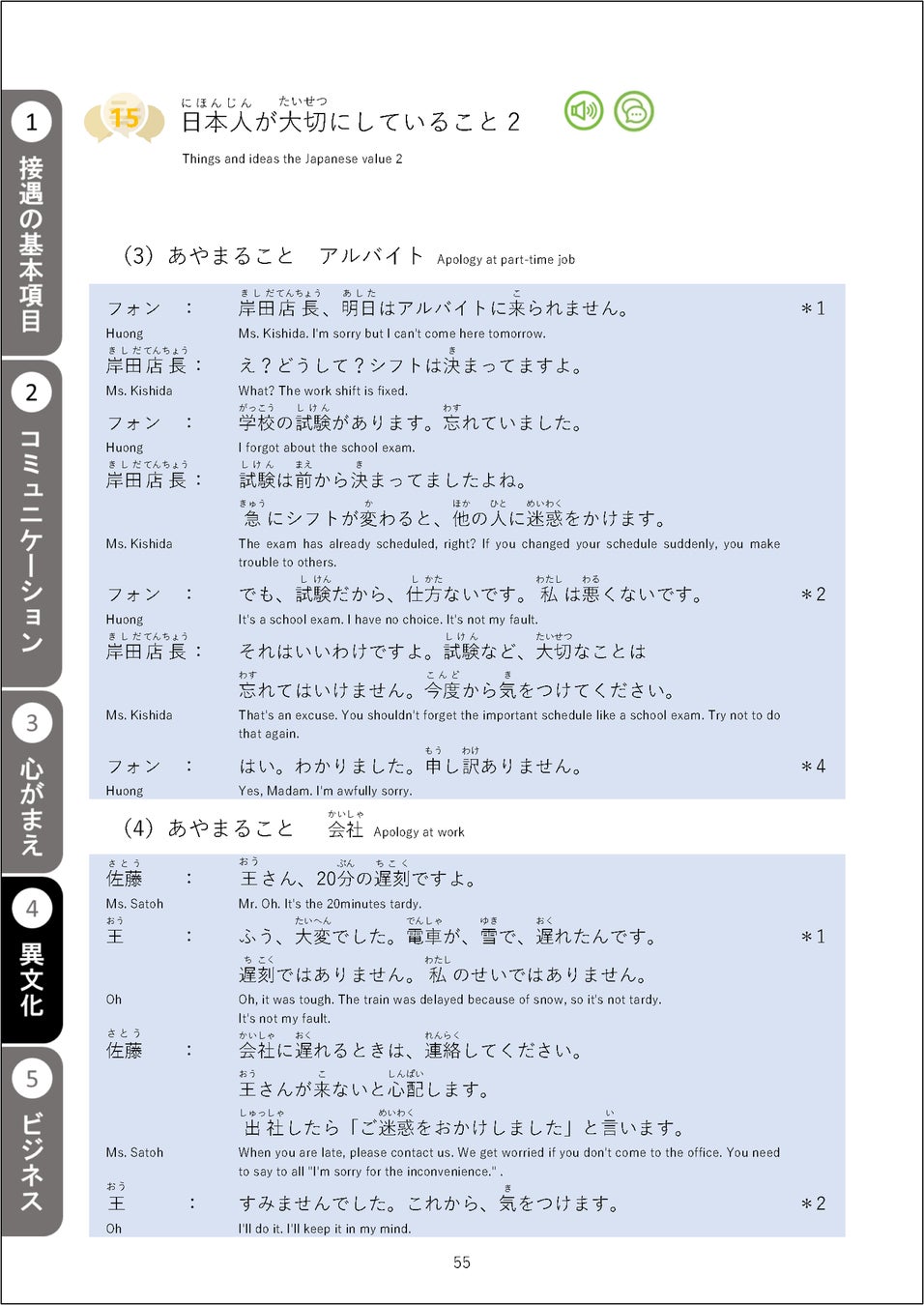 日本語のことばづかいだけでなく、状況にふさわしい表情や動作、心の持ち方にポイントをおいています。