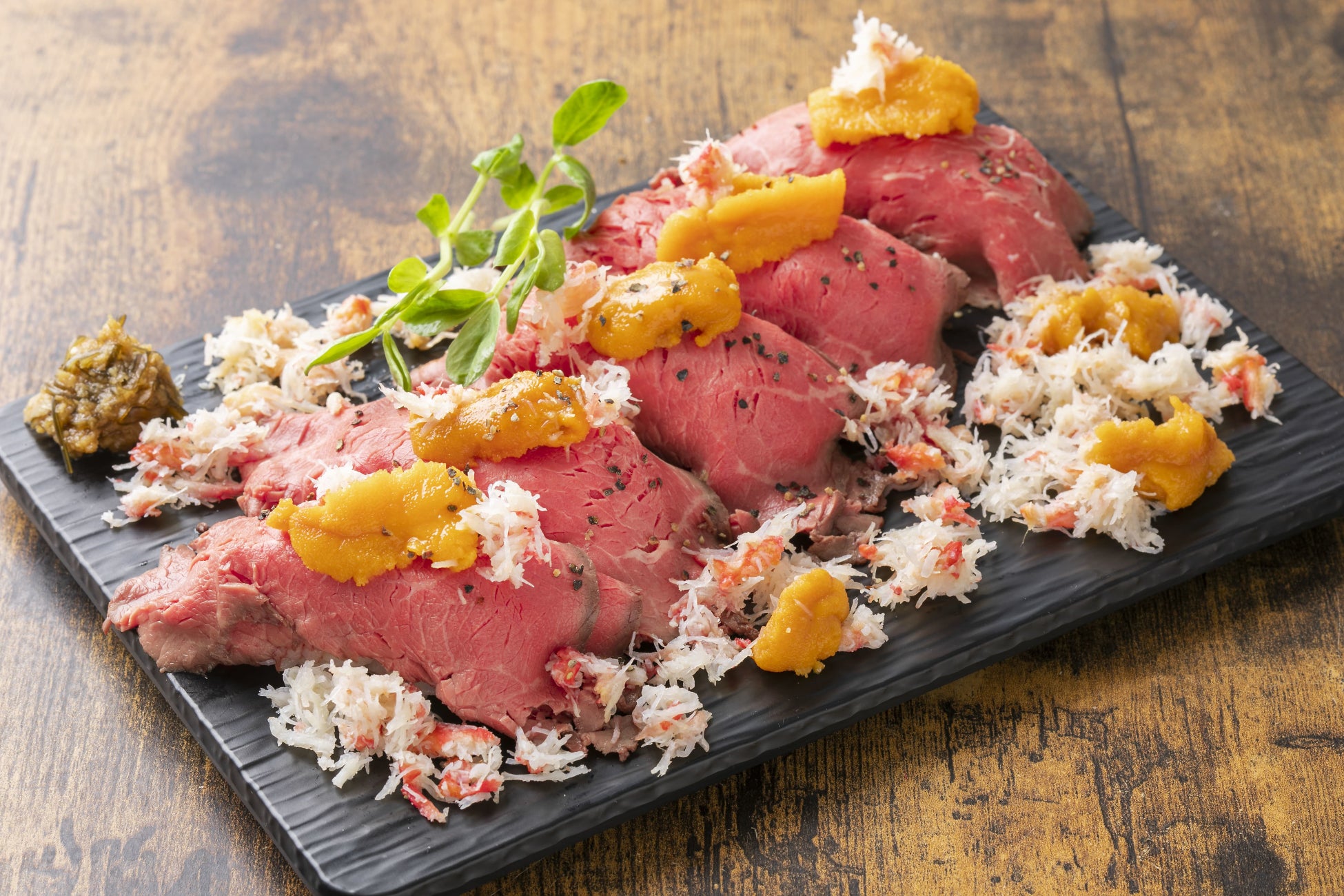 北海道産牛肉にウニとカニを贅沢にトッピング。肉と魚介の風味が絶妙にマッチ。