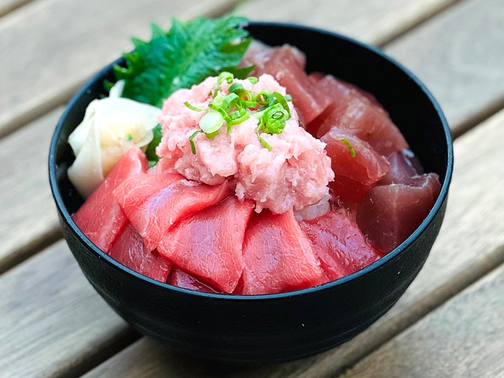 「常磐もの」を代表するヒラメ、アナゴ、シラウオ、阿武隈川の清流で育てられたメイプルサーモン、小名浜海星高校の生徒が実習船「福島丸」で獲ってきたマグロを使ったネギトロに、イクラも添えて海鮮丼に。