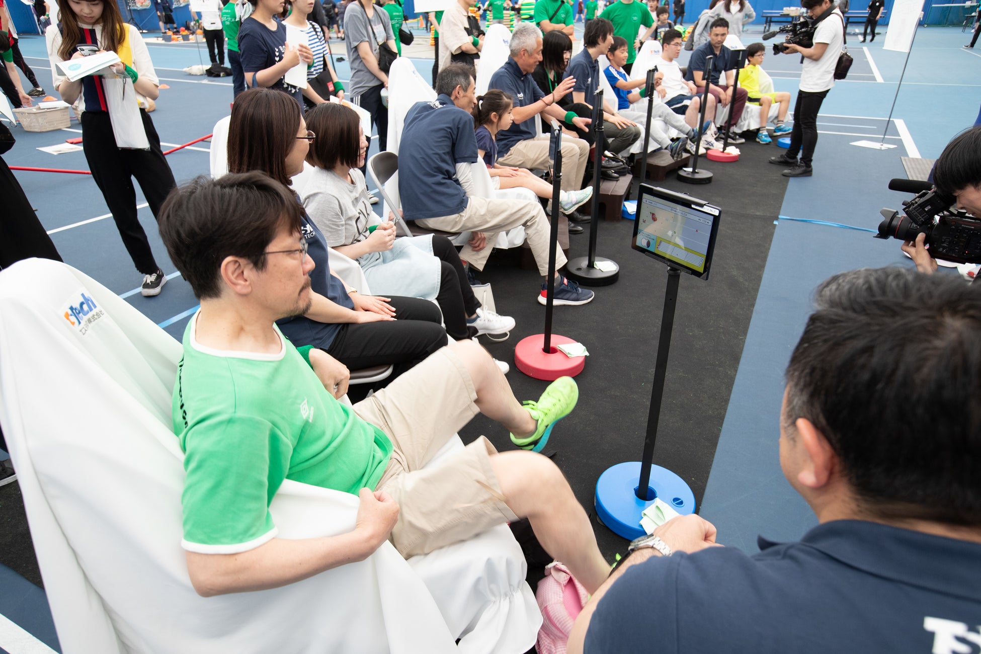 座った人の動きを検知してバーチャルプレイヤーが連動して走ります。身体を動かしてはいけない「緩コース」、むしろ身体を動かさなくてはならない「急コース」に分かれていて、ひとつのレースの中での「緩急力」を求められます。