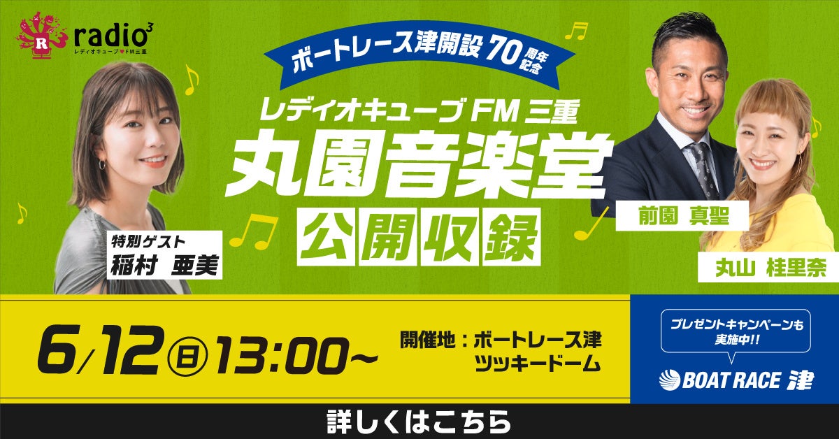 初日の6月12日(日)には、ボートレース津開設70周年を記念して、元サッカー日本代表、丸山桂里奈さんと前園真聖さんのお二人がパーソナリティをつとめるレディオキューブFM三重「丸園音楽堂」公開録音イベントを開催!(※1)スペシャルゲストとして、あの豪快なバッティング、“神スイング”でお馴染みの、稲村亜美さんをお迎えして、豪華な「スポーツトーク」満載で、皆さんをお迎えします!