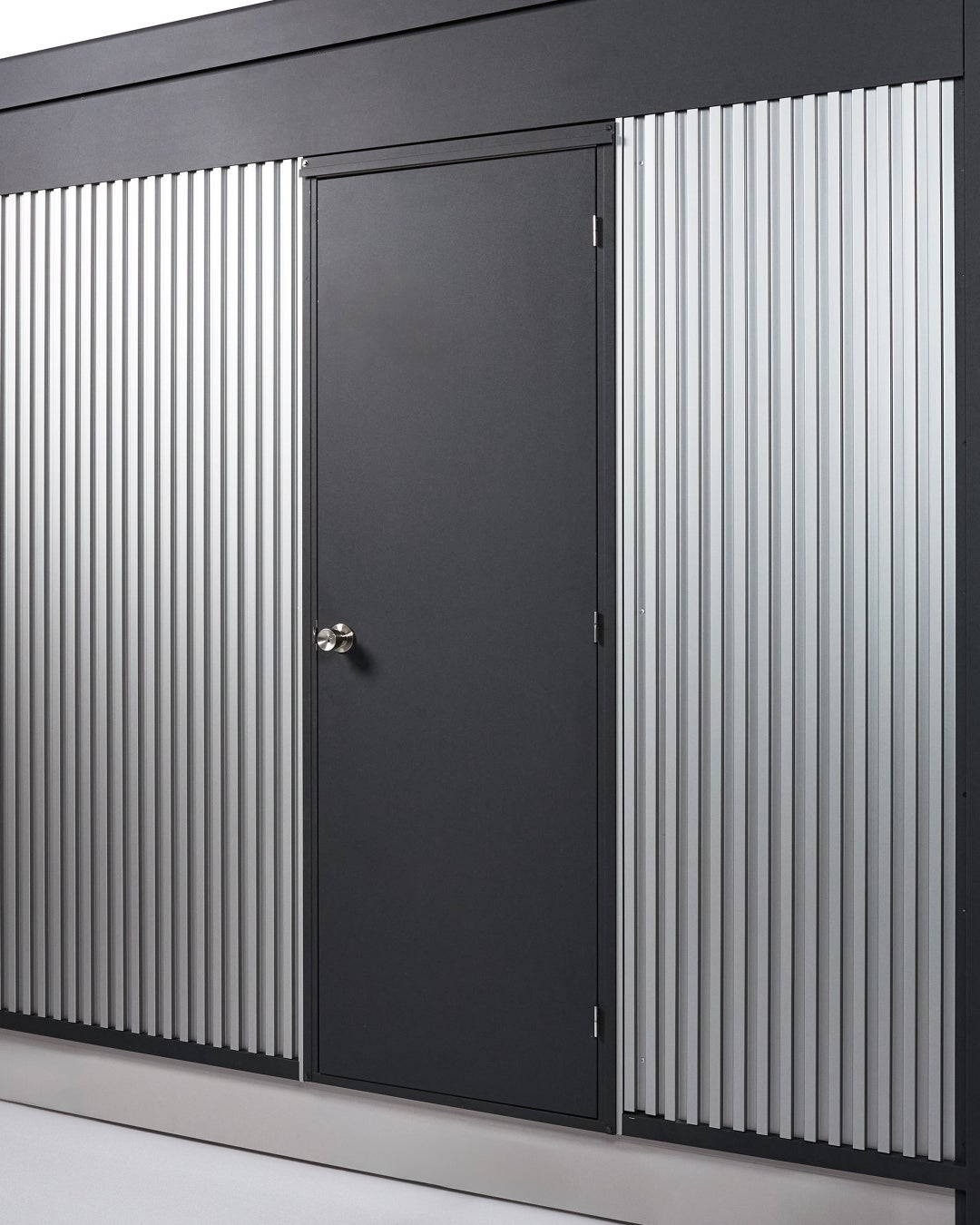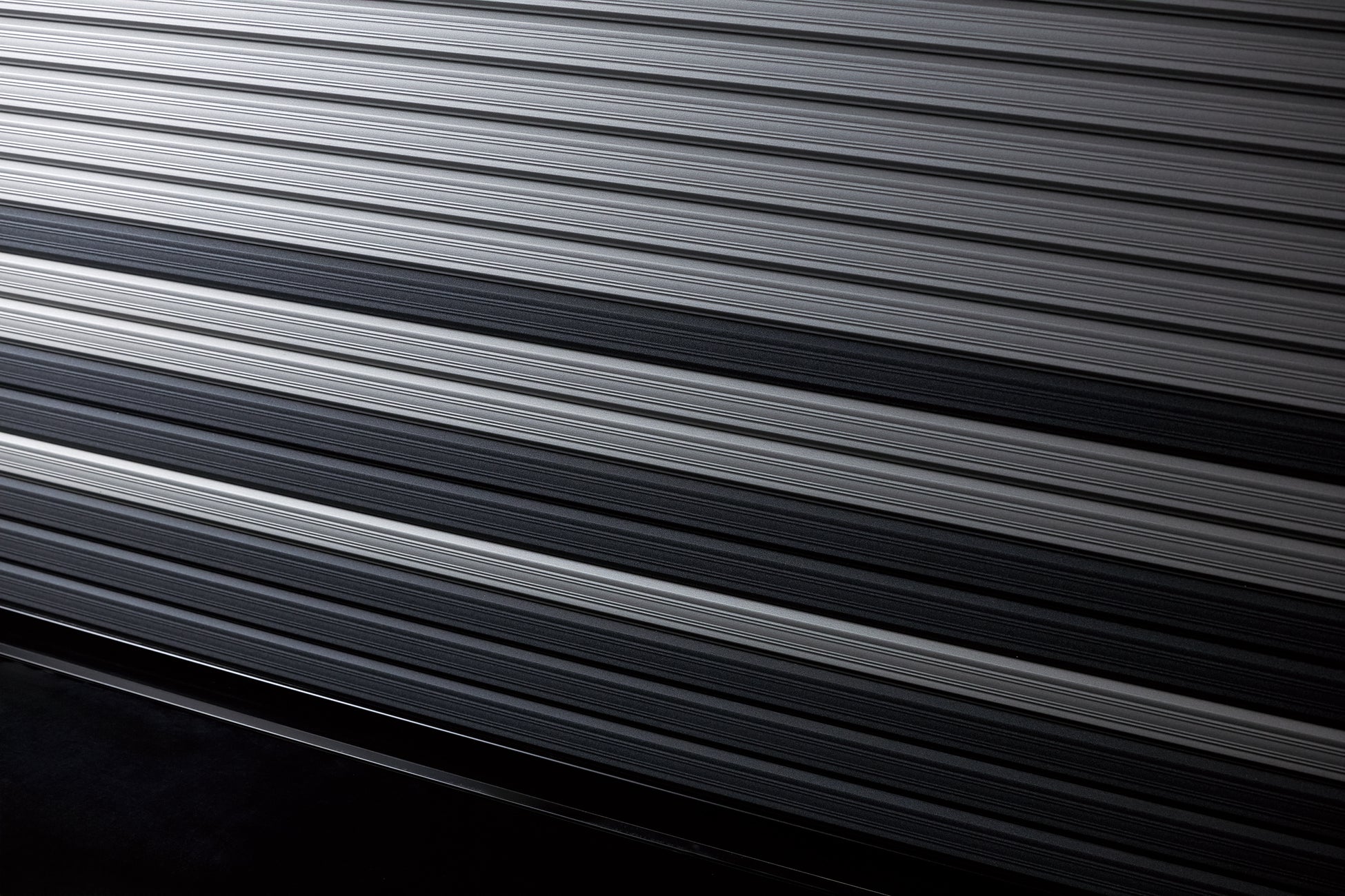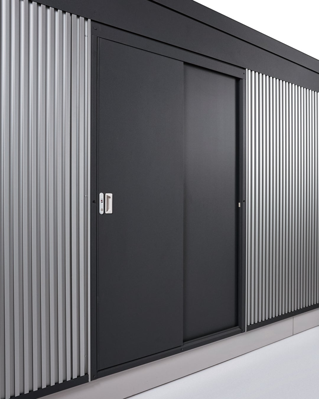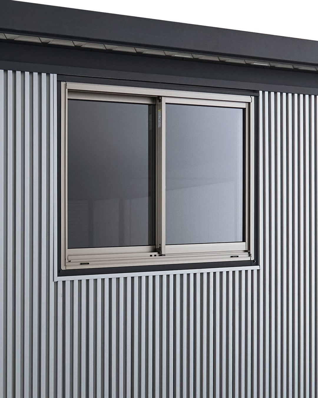 外装カラーとして化粧部材にマットブラック、外壁にシルバー、シャッターにグローシルバーとマットブラックのバイカラーを採用し、シックな外観に仕上げました。立体エンブレムやスリットをあしらった軒、壁面のヨドK型角波スパンが生み出す陰影が、上質で洗練された雰囲気を醸し出しています。