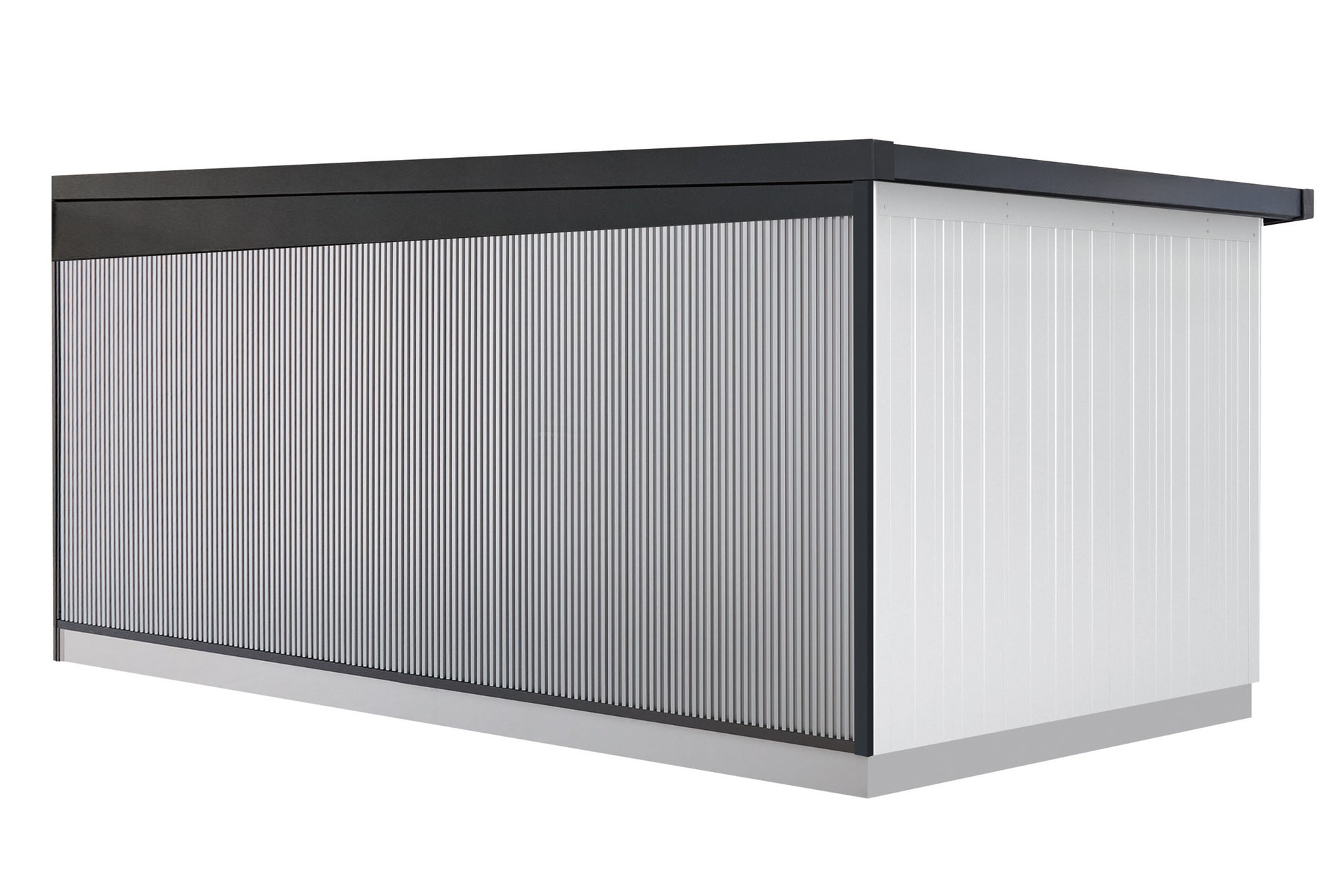 標準仕様の「ラヴィージュⅢ MODELLISTA×YODOKO」には、手動シャッター及び外装側面2面にヨドK型角波スパンが装着されます。基本棟に別途、追加棟を足して2連棟以上の連棟にすることも可能です。