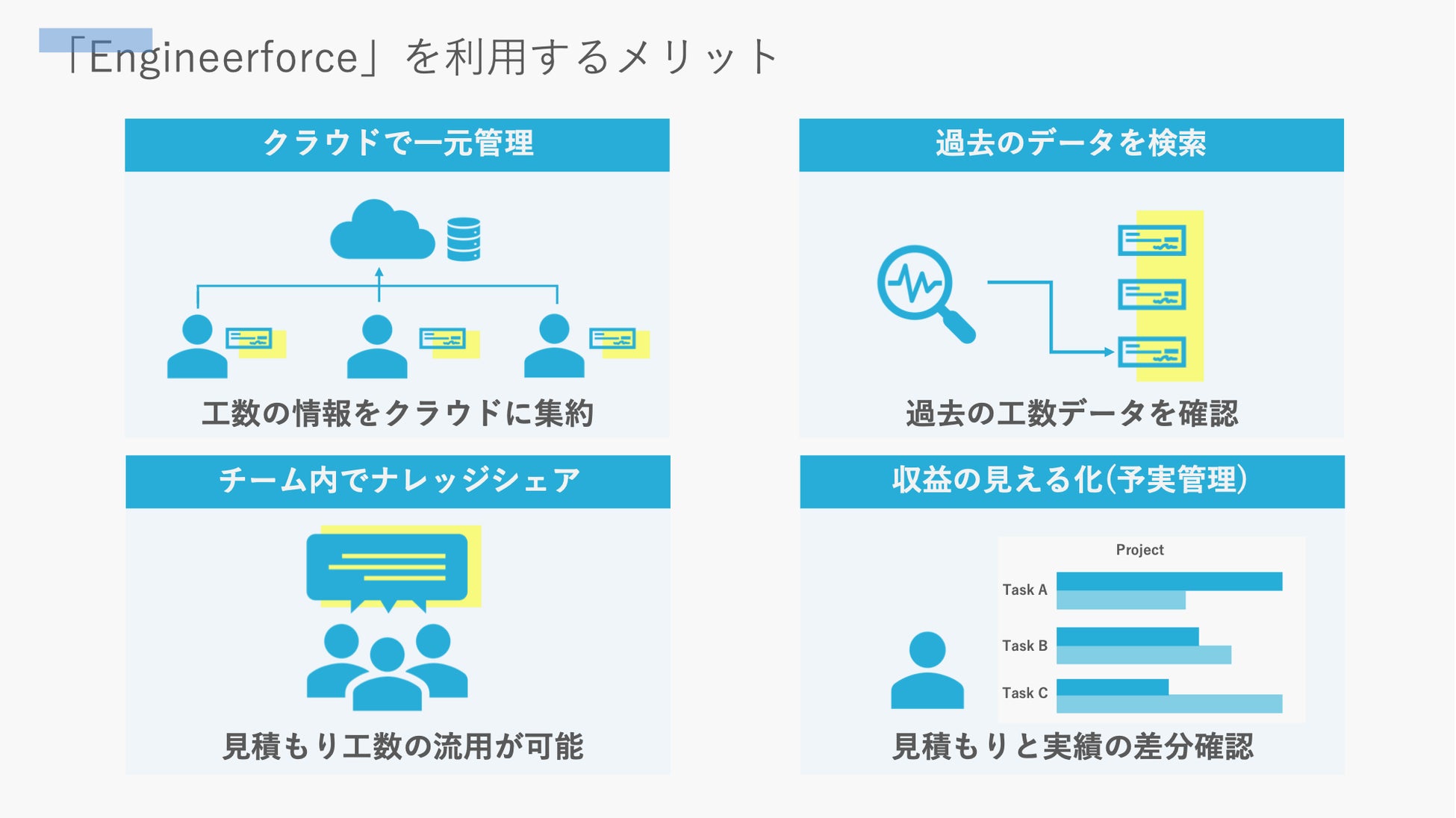 Engineerforceの見積もり作成ツールは、過去の見積もりデータを社内共有し、見積もり業務の精度向上と省力化を実現するためのツールです。担当者がこのツールを利用して過去の見積もりを参考にすることで、見積もり作成スキルの向上による想定外の利益低下の防止、見積もり時間の短縮などによるコスト削減効果が期待できます。また、見積もり工数と実際の発生工数のギャップを可視化するレビュー機能を持っており、見積もりミスの理由発見に役立ちます。