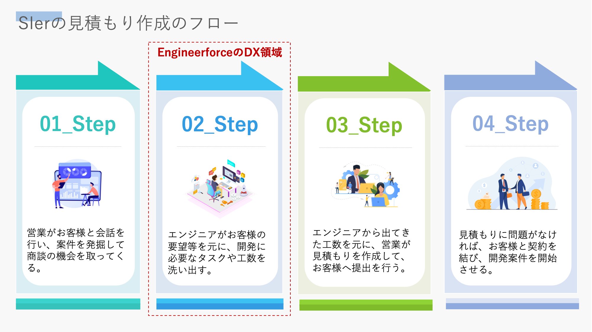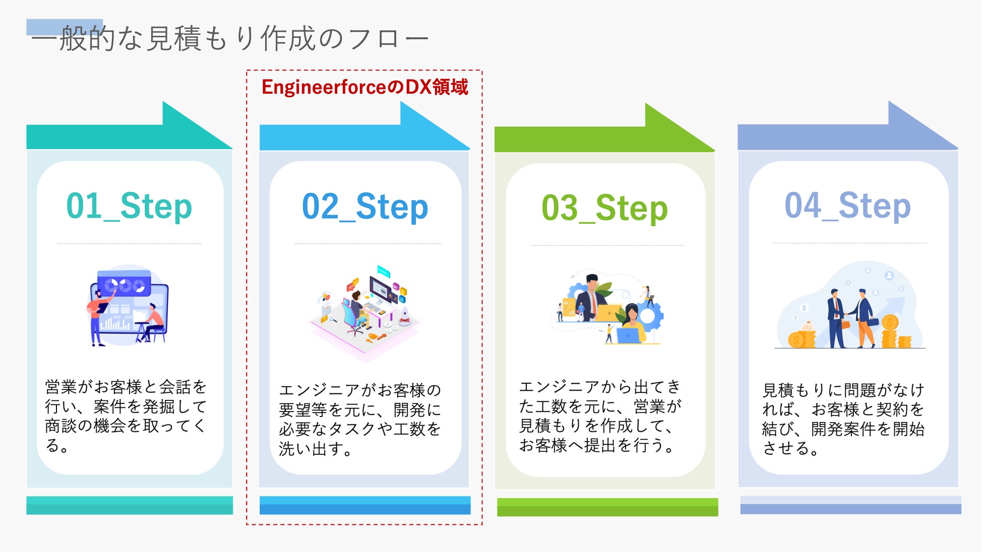 Engineerforceは、開発見積もりのナレッジシェアによって、属人的かつ都度対応になりがちな見積もり作成業務を平準化し、品質向上や作業時間の短縮を実現するSaaS型の見積もり作成ツールを提供する企業です。ソフトウェア開発会社のように、開発工数見積もりが重要な作業となる企業を顧客とし、高い評価を得ています。