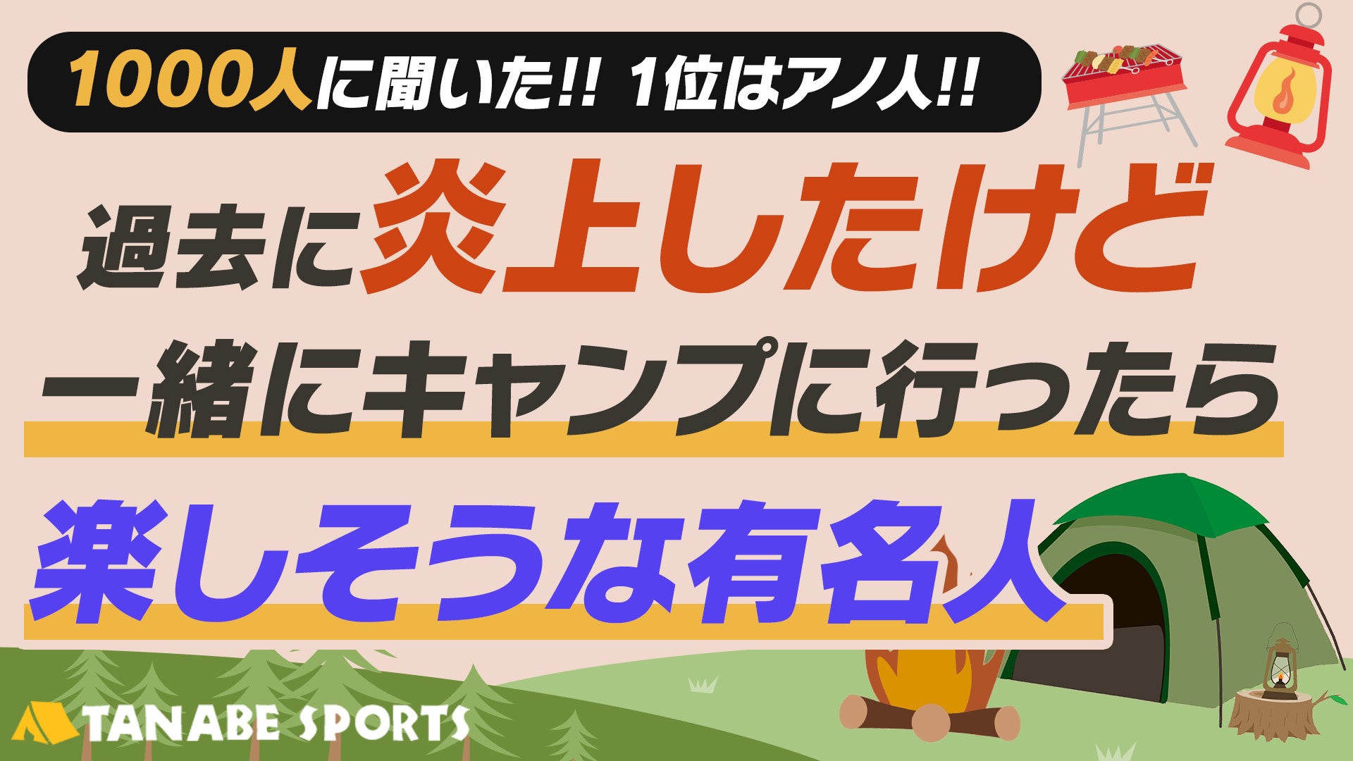今回、キャンプ用品レンタルサービスを展開する株式会社タナベスポーツは全国の男女1000名を対象に「過去炎上したけど一緒にキャンプに行ったら楽しそうな有名人は?」というアンケート調査を実施しました。
