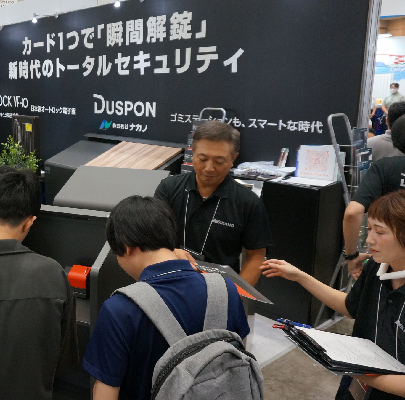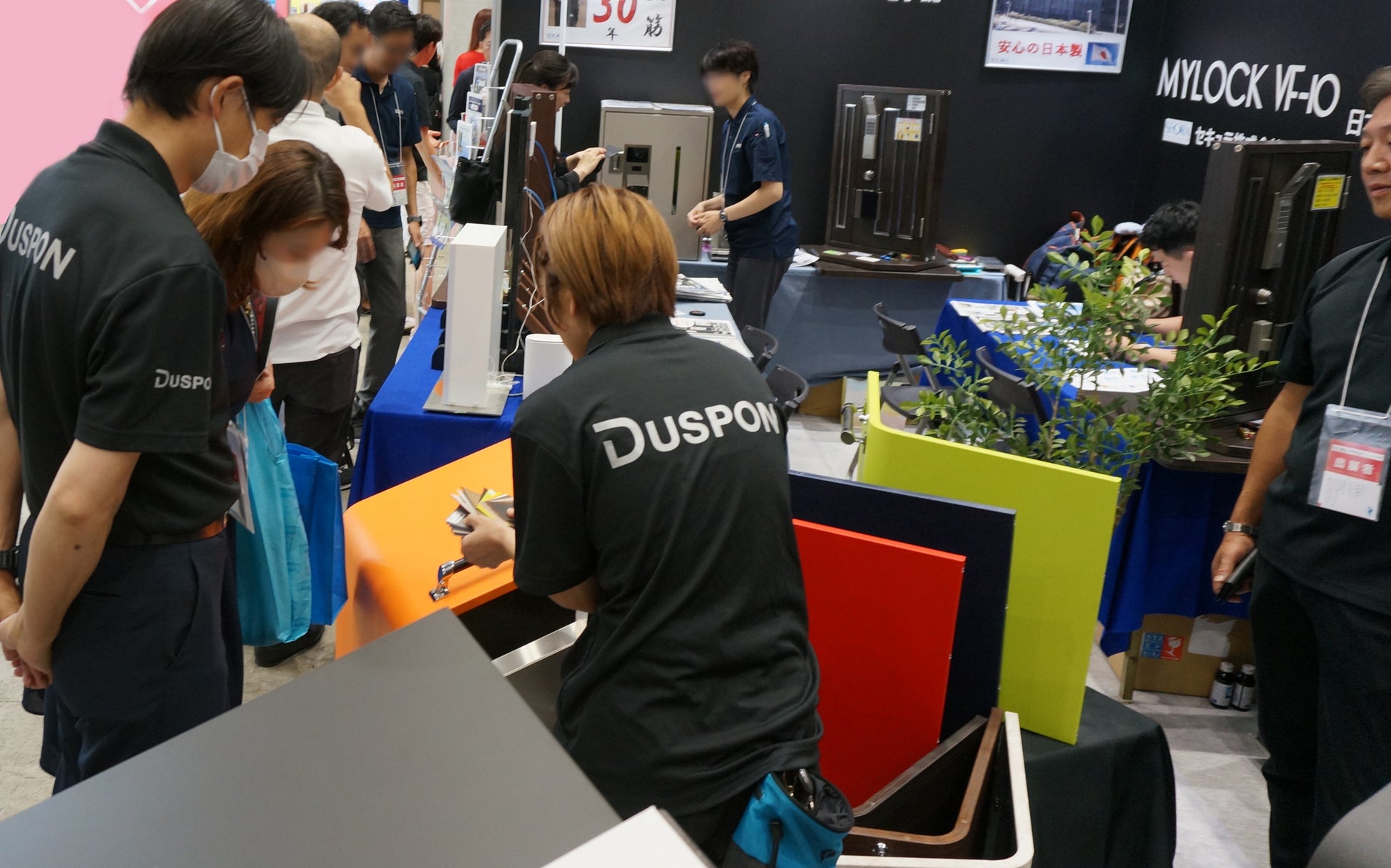賃貸住宅フェア(テナント・土地活用展含む)への来場者数は17,026人。弊社ブースへも850人近くお立ち寄りいただきました。弊社の商品は、ホームページか楽天の公式ショップで販売していることから、『ダスポン』を実際に見て触っての購入は難しく、告知を見て来場されたお客様からは、実物はやっぱり重厚感がありますねという声が多くありました。見た目の大きさからは想像出来ない繊細な作り、温かみのある曲線など、パソコンや携帯の画像では分からない部分に触れていただくことで細部までこだわる丁寧な作りを理解していただけるチャンスとなりました。特に、スライドダスポンの特徴である足下まで大きく開閉する扉は想像以上に軽く、辛い思いをせずにゴミを捨てられると、たくさんの共感をいただきました。今回の展示会では大型のインテリジェントダスポンをごみステーションとして実際に使用する際、タイマー機能を別途取り付けて使用する想定の説明に興味をお持ちの方が多く、セキュリティ機能への関心の高さがうかがえました。来場者からは「おしゃれ!」「宅配ボックス?」「ゴミステーションにするにはもったいない」などのお声をいただき、不法投棄やイタズラされにくいゴミステーションとして活用されるよう今後の活躍を期待します。
