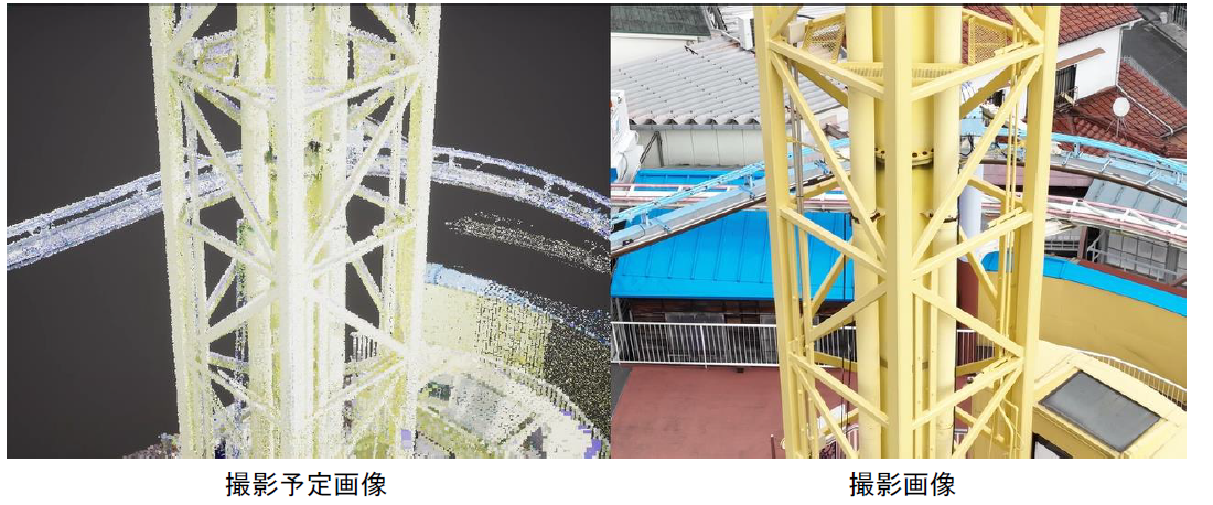 そこで今回、株式会社スカイブリッジが「スペースショット」の高精度な三次元点群データを作成して、そのデータを基に「ドローンスナップ」を活用しドローンの自動飛行・自動撮影を行いました。撮影結果は、遊具点検で必要とされる十分な精度であることが実証されました。当社と株式会社三井E&Sは、今回の実証における技術面のサポートを行いました。