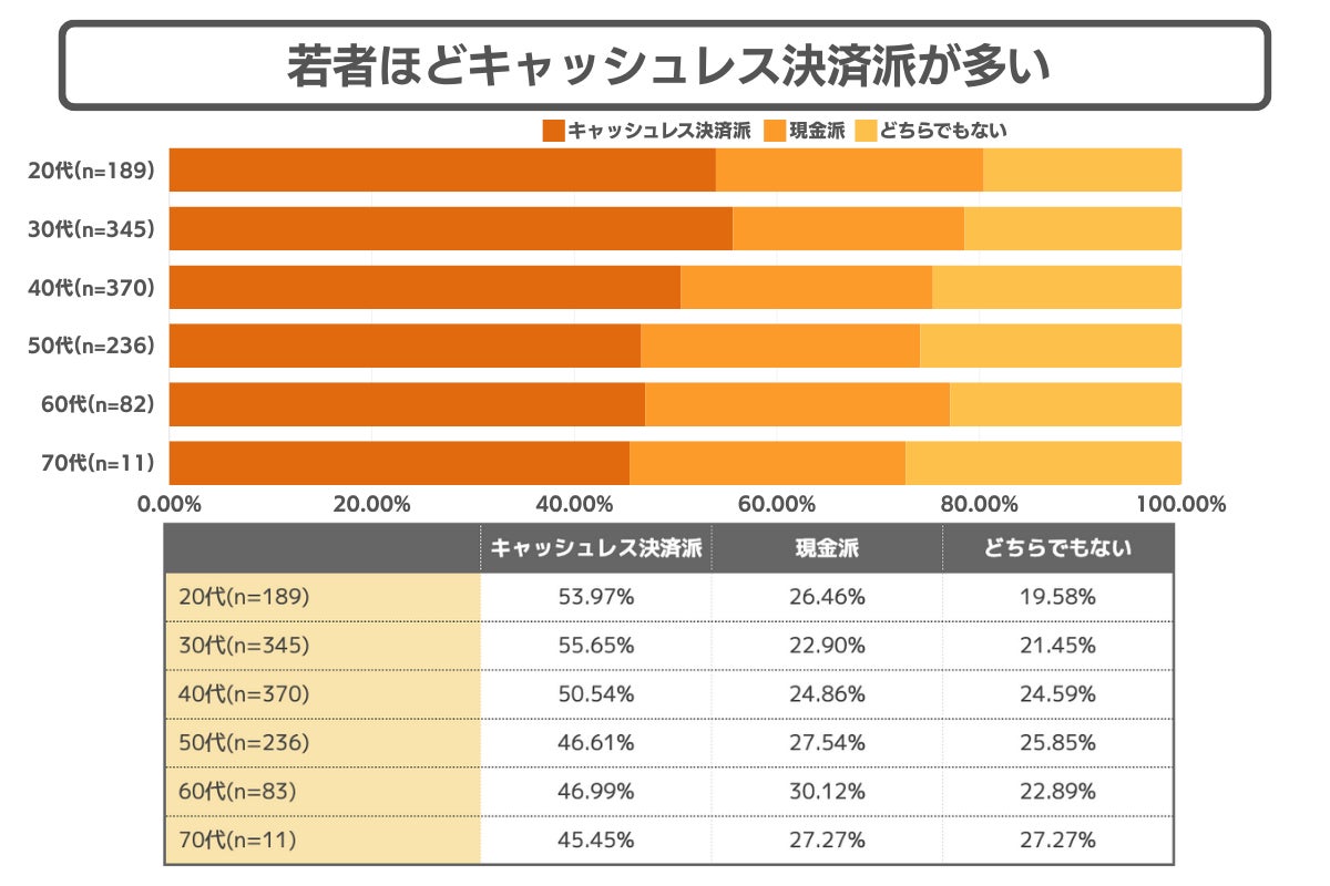 キャッシュレス決済を利用している比率は20代、30代で55%程度と50、60代と比べて10%程度の差がありました。