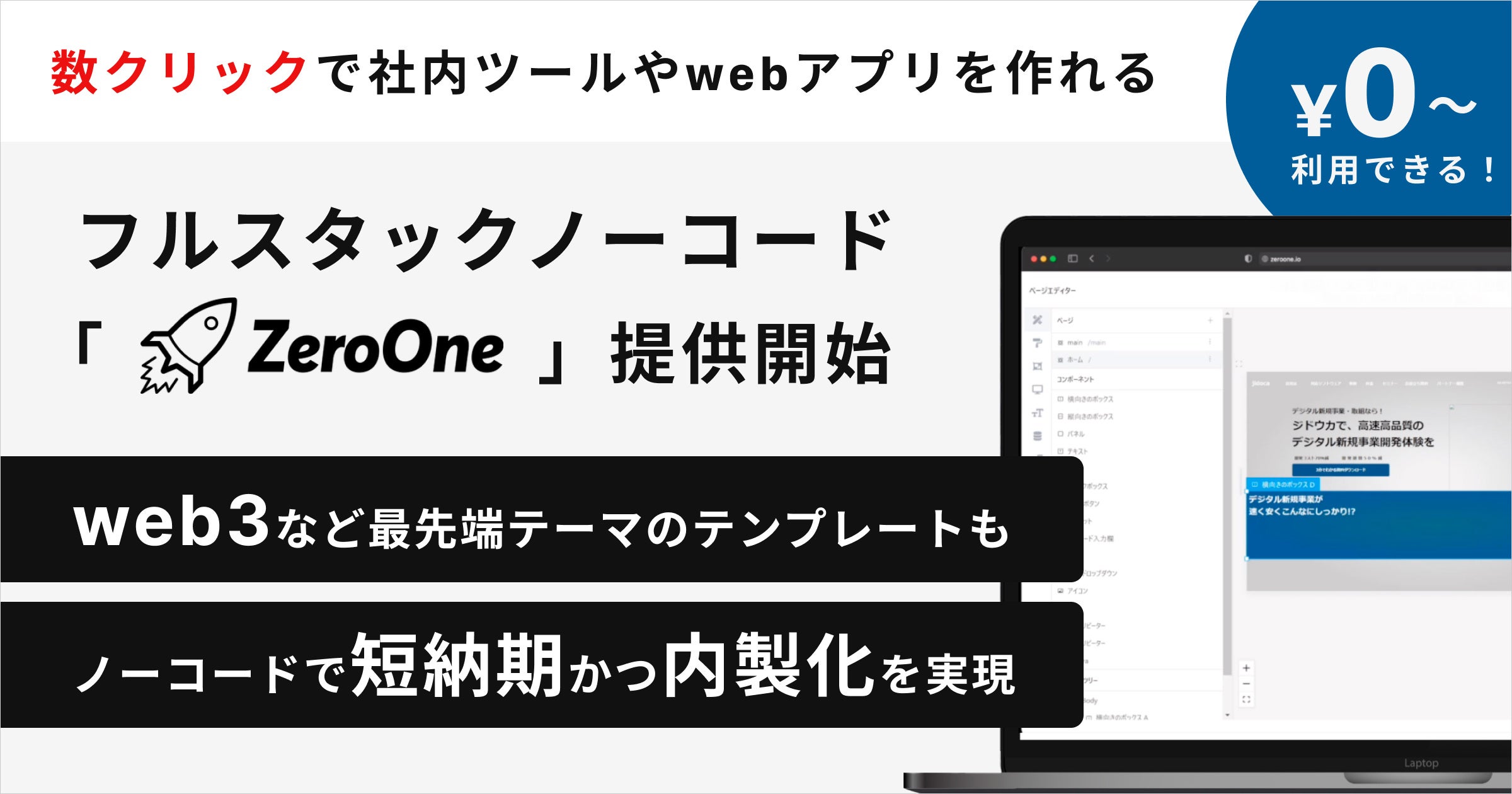 当社は、「新たな収益機会の創造」をミッションとし、「生産人口減少」をテーマに「新たな選択肢となる商品づくり」に取り組んでまいりました。そのメインプロダクトが『ZeroOne』です。『ZeroOne』は、ノーコードでシステム開発や変更ができる開発プラットフォーム。