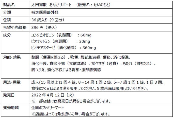 株式会社太田胃散(本社:東京都文京区/代表取締役社長:太田淳之)は、「太田胃散おなかサポート」を2022年4月12日(火)より全国のファミリーマート約16,600店にて先行販売します。