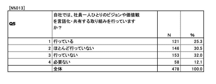その一方で、「社員一人ひとりのビジョンを把握しているか」「理念と個人の価値観をすり合わせる取り組みを行っているか」といった実態に関する設問では、「実施している」と回答した割合は約25%にとどまりました。