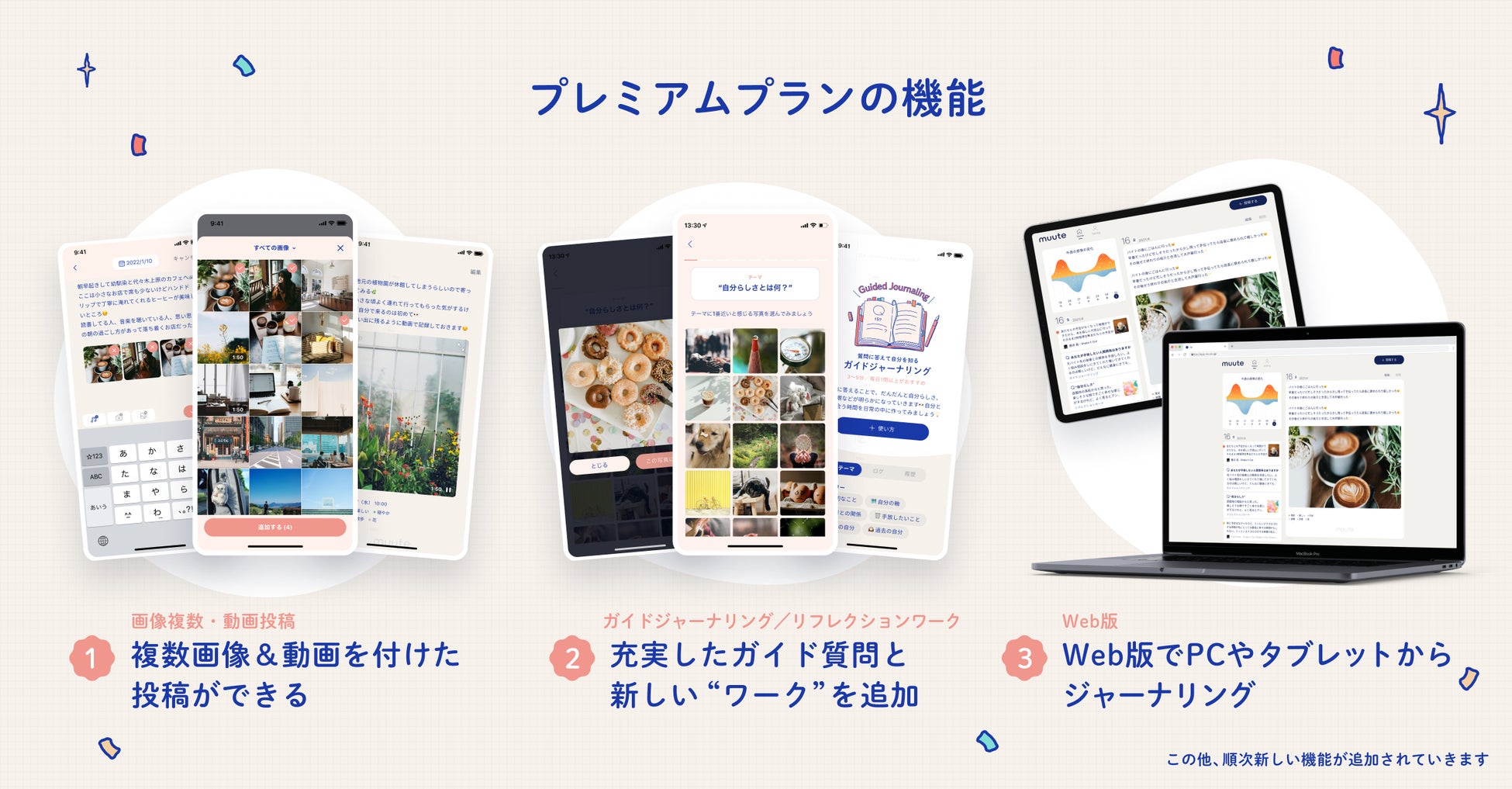 2020年12月のサービス提供開始から1年以上が経過し、約50万人の方にmuuteをお使いいただいております。これまで多くのユーザーからポジティブな声をいただき、「よりよく自分を知る」というmuuteの提供価値について多くの学びがありました。プレミアムプランでは、これまでの学びを踏まえ、より高く価値を実現するための新機能を提供します。今回のプレミアムプランでは、「画像複数・動画投稿」「ガイドジャーナリング/リフレクションワーク」「Web版」3つの新機能を提供を行いますが、今後も引き続き新機能追加/機能改善を行いプレミアムプランを充実させていく予定です。