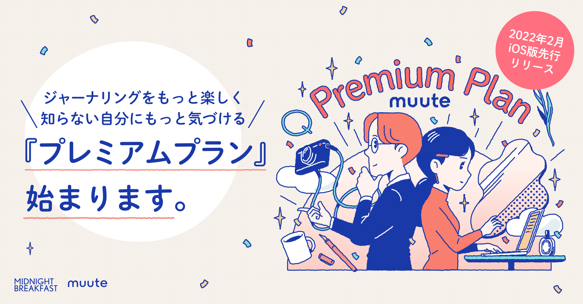 プロダクトスタジオのミッドナイトブレックファスト株式会社(本社:東京都渋谷区、代表取締役:喜多紀正、以下、「当社」)は、当社が開発・運営するAIジャーナリングアプリ「muute(ミュート)」が2022年2月よりプレミアムプランの提供を開始しました。