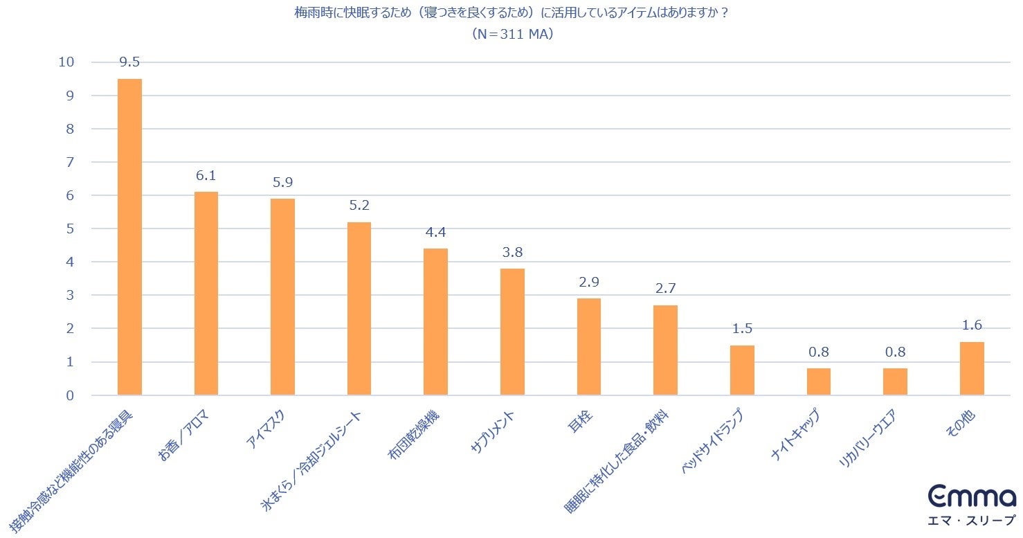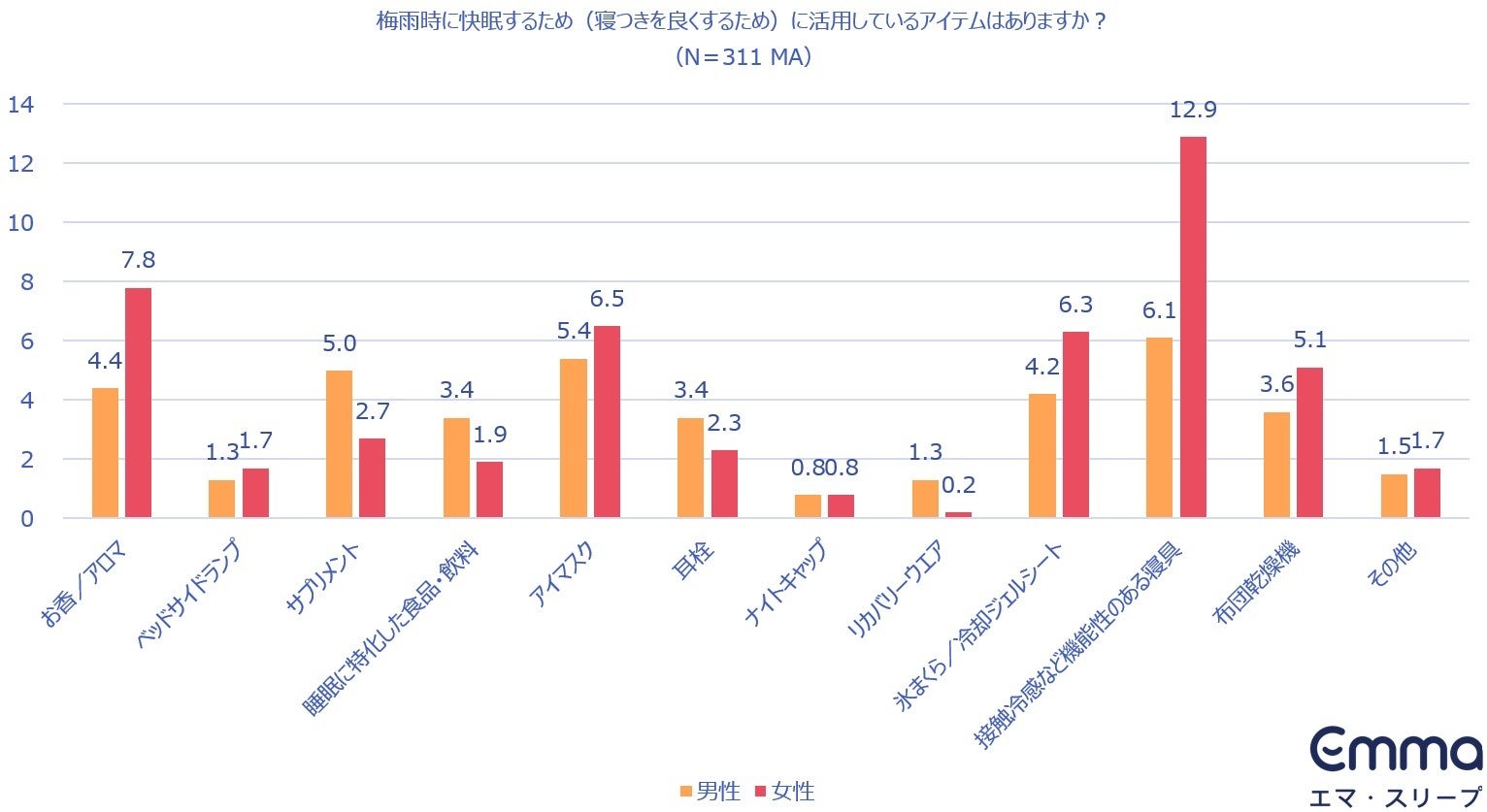 梅雨時に快眠するために活用しているアイテムについては、男女とも「接触冷感など機能性のある寝具」が1位になりました。また、それに続くグッズについて、女性では「お香/アロマ」「アイマスク」、男性では「アイマスク」「サプリメント」を使用している人が多い傾向にあることがわかりました。