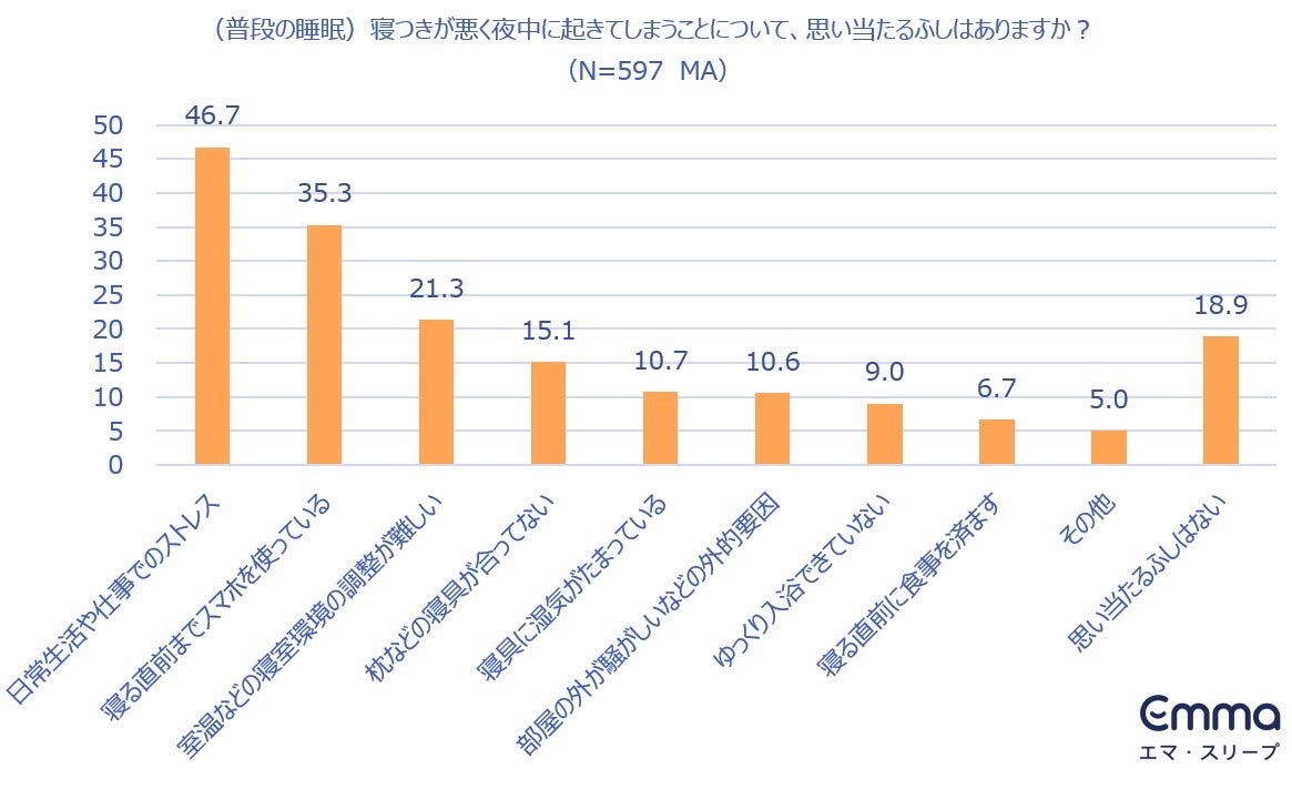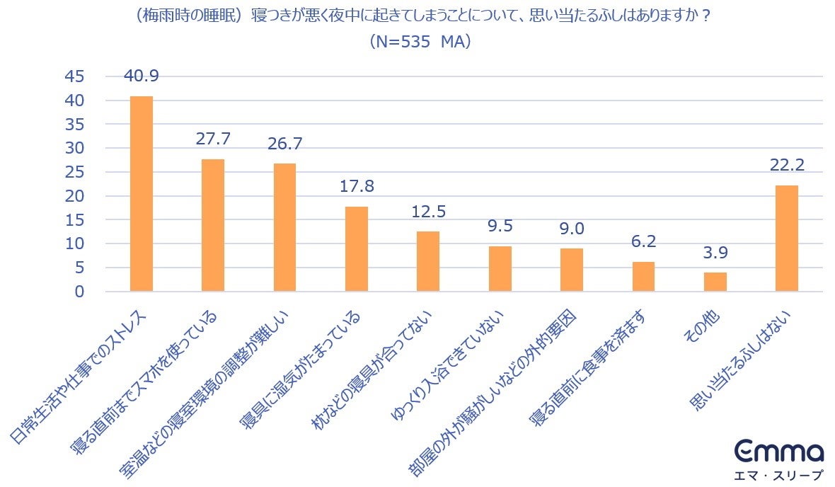 「寝つきが悪く夜中に起きてしまうことについて、思い当たるふしはありますか?」という質問に対して、梅雨時、通常時ともにTOP3が「日常生活や仕事でのストレス」(梅雨時:40.9%、通常時46.7%)、「寝る直前までスマホを使っている」(梅雨時:27.7%、通常時:35.3%)、「室温などの寝室環境の調整が難しい」(梅雨時:26.7%、通常時:21.3%)という結果になり、日常生活や仕事のストレスが睡眠に悪影響を与えていることがわかりました。