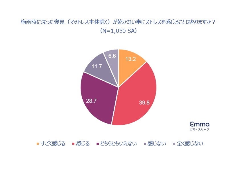 また、「梅雨時に寝具(マットレス本体除く)を洗えないことにストレスを感じることはありますか?」という質問に対しては、42.6%(すごく感じる9.1%、感じる33.5%の合計)がストレスを感じると回答し、「梅雨時に洗った寝具(マットレス本体除く)が乾かないことにストレスを感じることはありますか?」に対しても53%が感じると回答(すごく感じる13.2%、感じる39.8%の合計)。洗濯ができないことよりも乾かないことに対してストレスを感じている人が多いことがわかりました。これは梅雨のある日本独自の結果と言えるかもしれません。