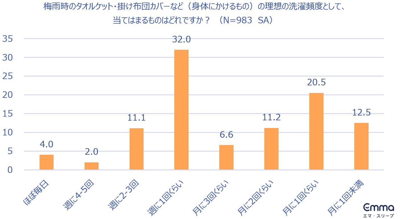 「梅雨時の理想の寝具の洗濯頻度」については、「週1回くらい」(32.0%)が最も多く、梅雨時でも洗濯をして清潔感を保ちたいと考えている人が多くいることがわかりました。