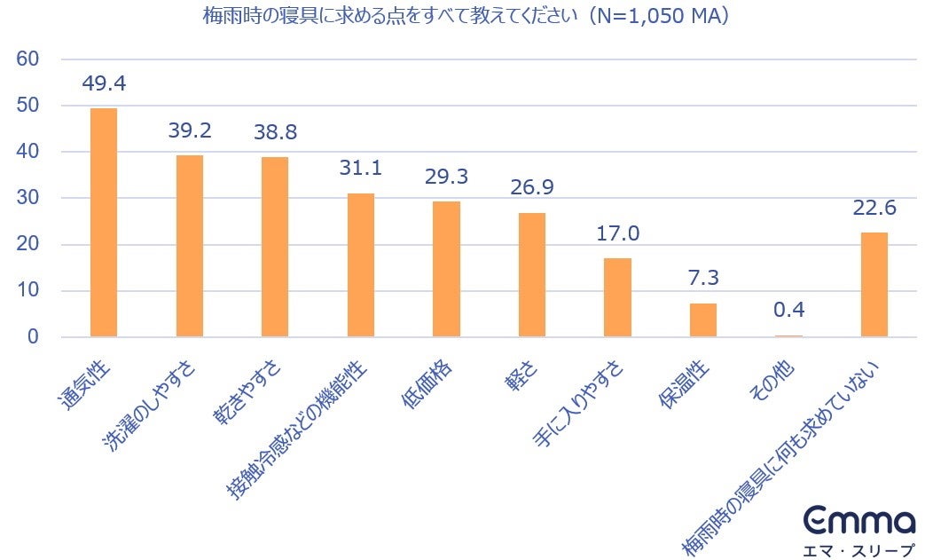 「梅雨時の寝具に求める点」については、「通気性」(49.4%)、「洗濯のしやすさ」(39.2%)、「乾きやすさ」(38.8%)と上位になりました。