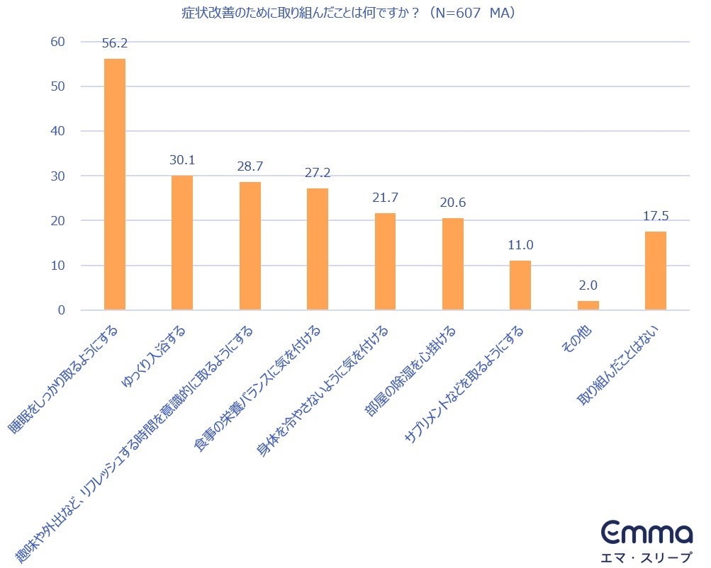 「梅雨が原因で体調を崩したことはありますか?」という質問に対して、57.8%の人が何らかの不調を感じたことがあると回答しました。また、症状改善のために取り組んだことに関しては、「睡眠をしっかり取るようにする」(56.2%)が最も多く、「ゆっくり入浴する」(30.1%)「リフレッシュする時間を意識的にとる」(28.7%)と続きました。