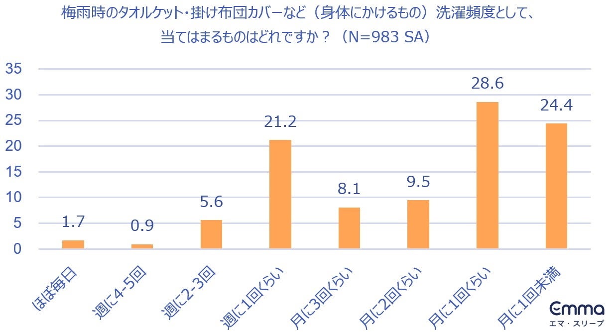 今年も梅雨シーズン到来!『梅雨時の睡眠と寝具に関する意識調査』を発表 梅雨時の理想の洗濯頻度を週1回くらいと回答する人が最も多い一方、半数以上の人が実際は月1回程度の洗濯頻度にとどまっている結果に