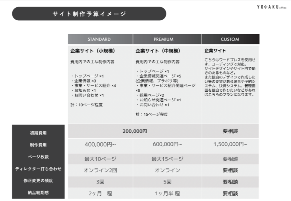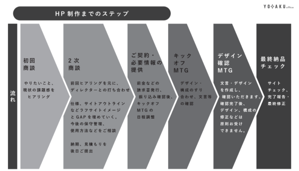 YOHAKU Officeの「ホームページ・メディア制作プラン」は、専門ディレクター(顧問デザイナーまたは顧問マーケター)が直接お客様とお打ち合わせさせていただきますので、戦略的かつイメージ通りのホームページ制作が叶います。
