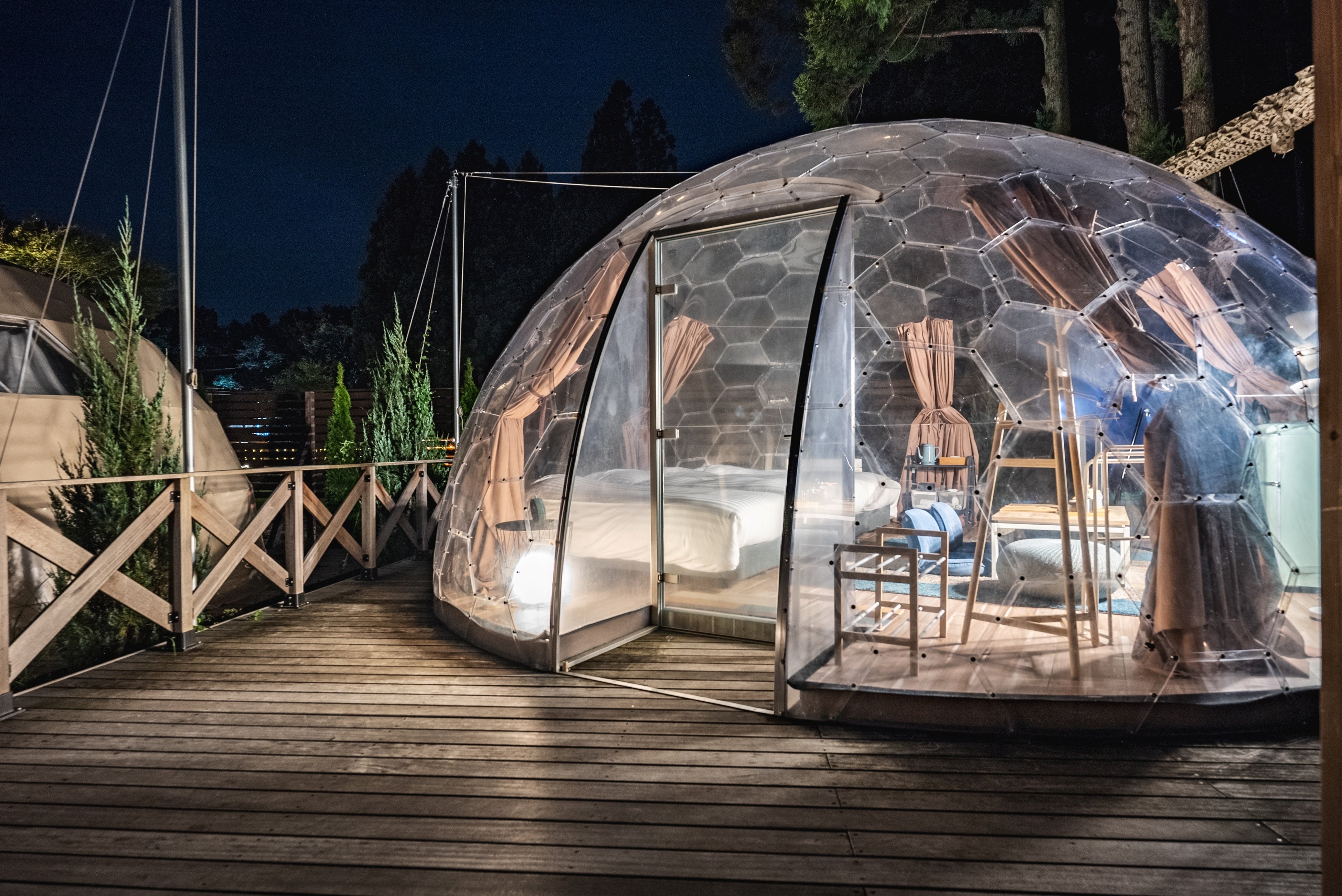 駿河湾と富士山がパノラマ展望できる絶景アウトドアリゾート「天空テラス」は、日本初の断崖絶壁にドーム型テントが並ぶグランピング施設です。全棟のテラスには開放的なプライベートバスを設置しており、ホテルのスイートルーム並みに快適な環境でお客様をお迎えします。本格ガスグリルを使用したアメリカンBBQにキャンプファイヤーなど、アウトドアならではの楽しみも満喫できる贅沢な空間です。