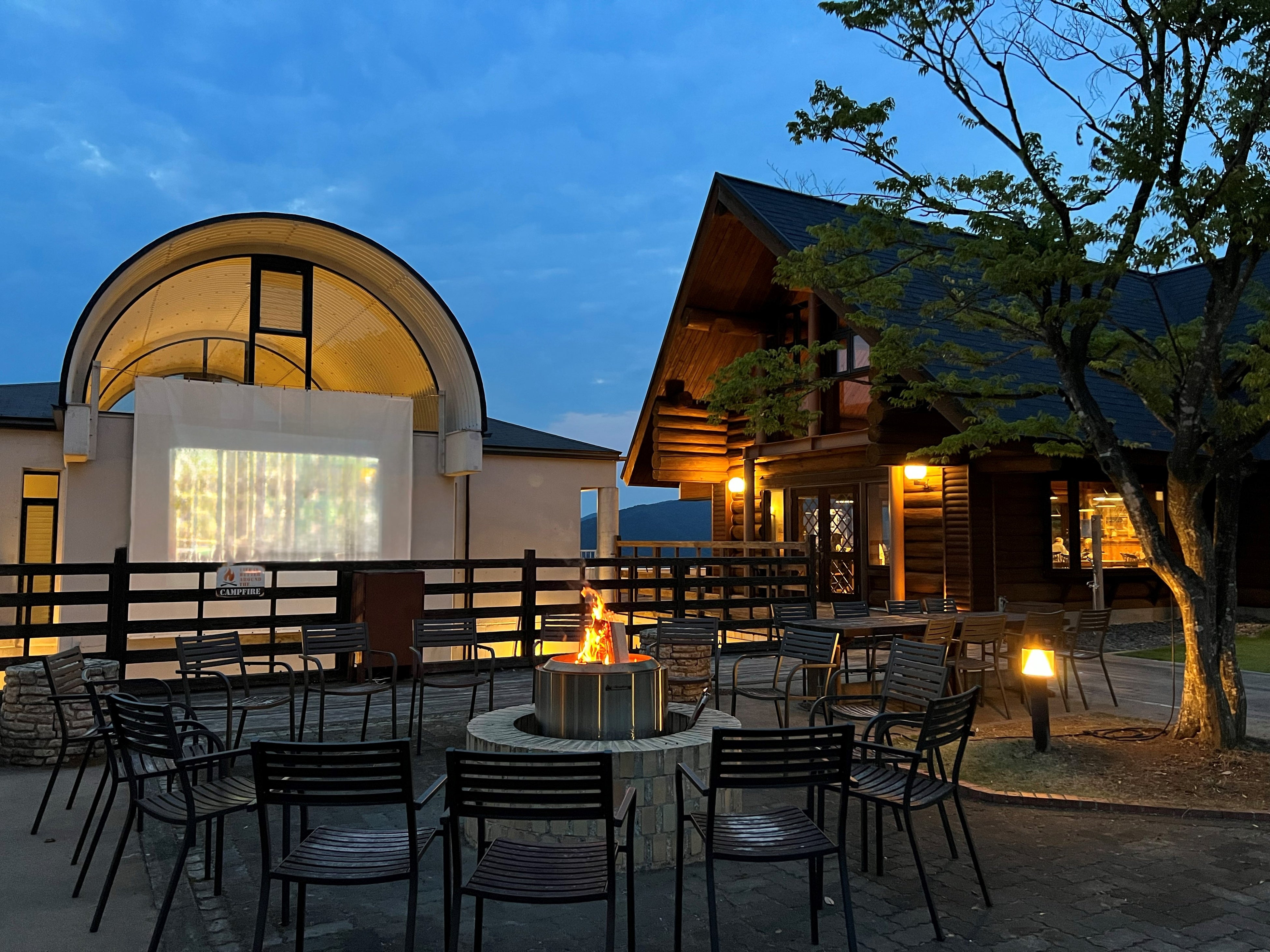 施設内容:大浴場、貸切風呂(信楽焼き半露天風呂)、シャワールーム、BBQ棟、展望デッキ、キャンプファイヤー&ナイトシネマ、フロント