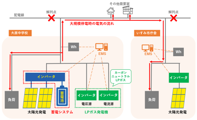 いすみ市では、令和元年の台風15 号の影響により⾧時間の広域停電が発生したことから、防災・BCP の取り組みを推進する「国土強靭化地域計画」を策定し、「強靭ないすみ市」を目指してきました。本事業は「国土強靭化地域計画」の一環となり、関電工によって設置されたLP ガス発電機・太陽光発電・蓄電システムの3つの電源と、それを統合制御するEMS※2を用いて、大規模停電発生時に安定した電力供給を行います。これによりいすみ市では、災害時拠点のいすみ市役所・指定避難場所の大原中学校に対して、非常時に少なくとも約4日間の電力供給が可能となります。またLPガス発電機・太陽光発電・蓄電システムは、非常時の活用のみならず、平常時には電力使用量が多い時間のピークカットや太陽光発電の有効活用により、電気料金の削減に寄与します。