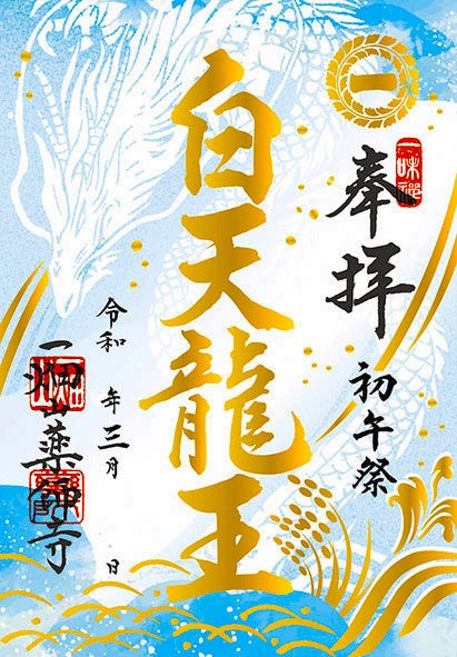 一畑山薬師寺が、3月限定「箔押しご朱印」を頒布開始。3月のご朱印は「白天龍王」様・「波夷羅(はえら)大将」様