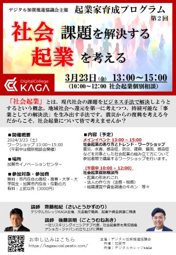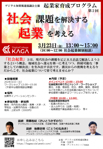 石川県加賀市では、3月23日に第2回起業家育成プログラム『社会課題を解決するための創業を考えるワークショップ』をデジタル加賀推進協議会が開催します。「社会的価値の新規創造(ソーシャルスタートアップ)」とは、震災や感染症など社会スケールの課題に対して「事業としての解決法」を生み出す手法です。