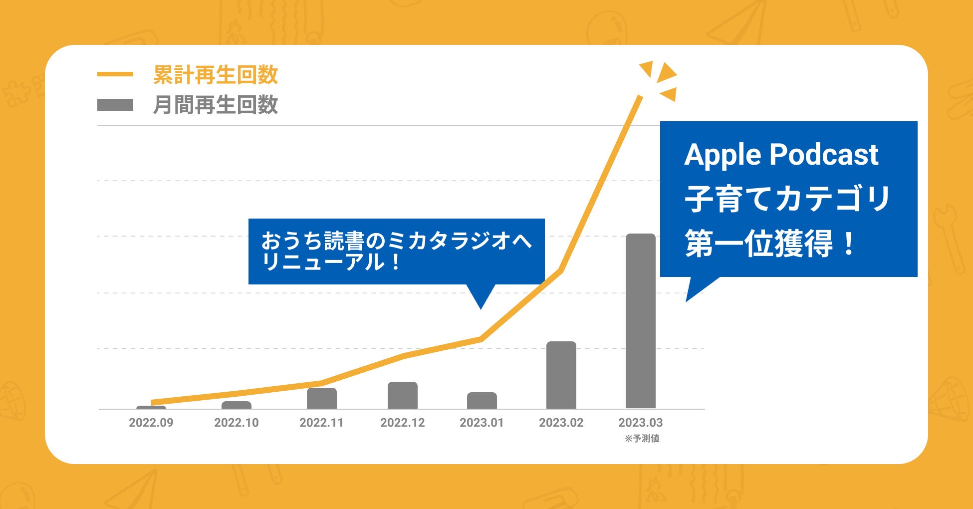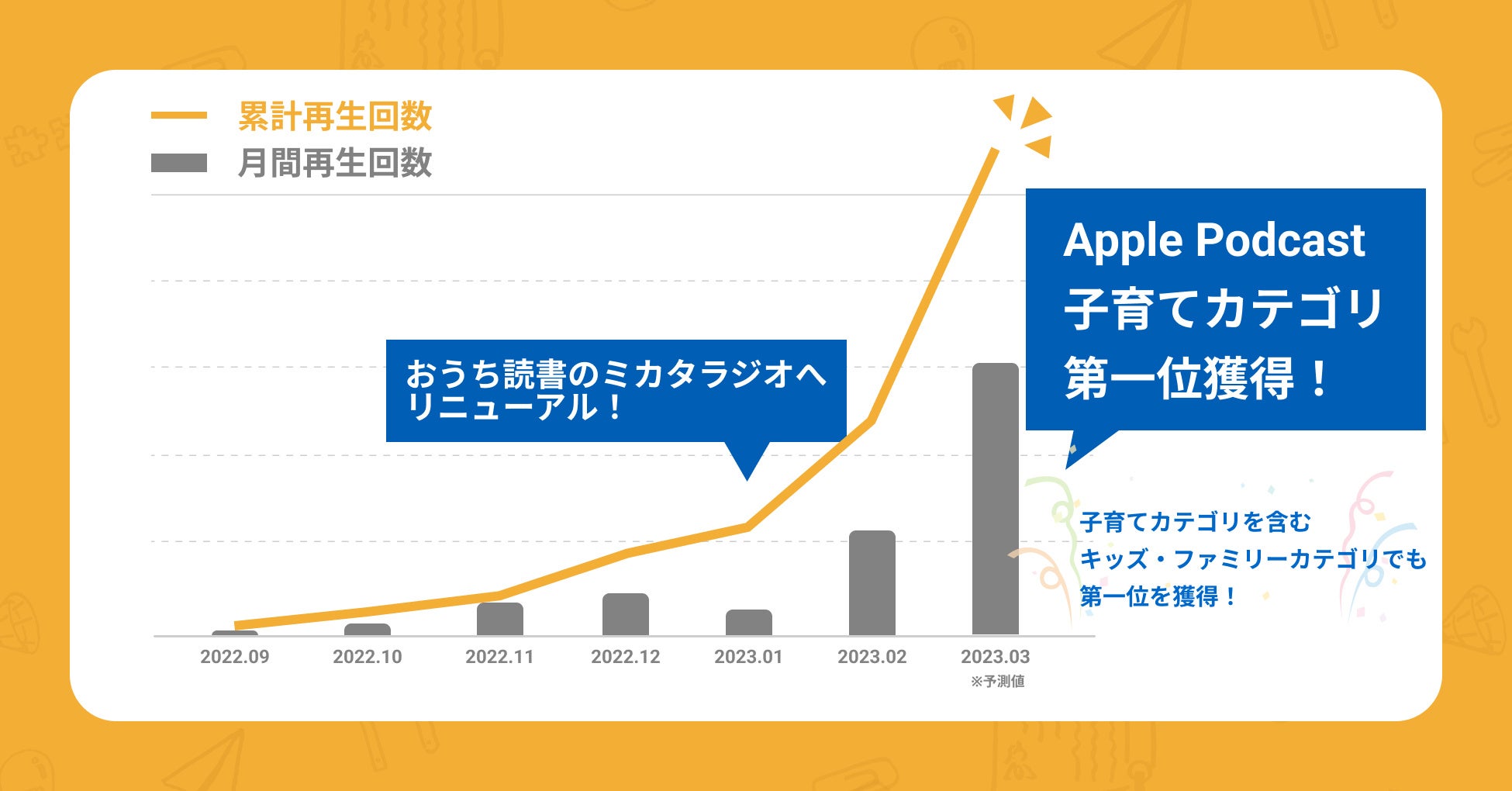 そして、実際にリニューアルを実施した2023年1月より1ヶ月半で月間再生数が約9倍(※2)に増加し、Apple Podcast Ranking子育てカテゴリで第一位、また子育てカテゴリを含む「キッズ/ファミリー」カテゴリ全体でも第一位を獲得する(※3)など、子どもの読書にまつわる子育て家庭の悩みの深さを裏付ける結果となりました。