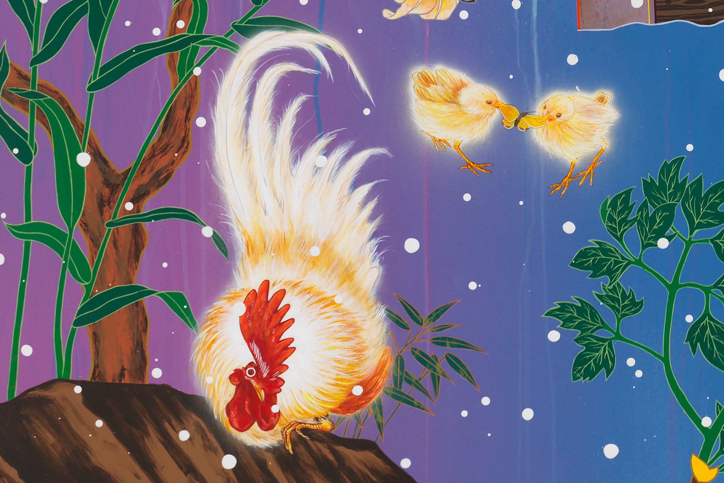 難解で、同時に動的なエネルギーに満ちているかがわかります。《Another Believer》は現代におけるアイデンティティの意味と、バランス化された社会の生態系にアプローチしていきます。数か月の時間をかけ細部まで丁寧にそして重層的に描かれた花々や、動物、衣服の生地、紋様は見る者を深い思索へと誘います。画面中央の人物の思慮深く微光を放つかのような姿は、まるで時空を超えて現実と非現実との境界線上を漂うようかのようであり、中世の装飾写本の登場人物を想起させます。作品全体を見渡せば、見る者の視点は直ちに人物の立つ開かれたスペースと背景の山々が同居する構図へと誘われ、同時に二次元性を強調する意図的な線によって絵画の外へと押し戻されます。このような、フラットでありながら活き活きとした独自の遠近法は、松山の素晴らしい技術を際立たせています。