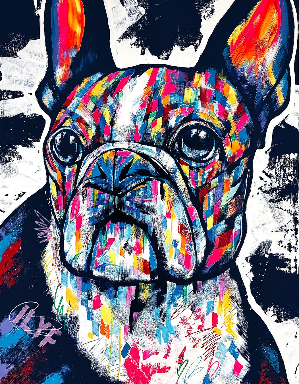 伝統的な肖像画の構造をベースにしながらも、そこに大胆で革新的な表現を加えることで、観る者に強烈な印象を与える。豊かな色彩と力強い筆致によって、表情のわずかなニュアンスまで丁寧に描き込み、それぞれの犬が持つ「魂」と「個性」をキャンバスに刻み込んでいる。