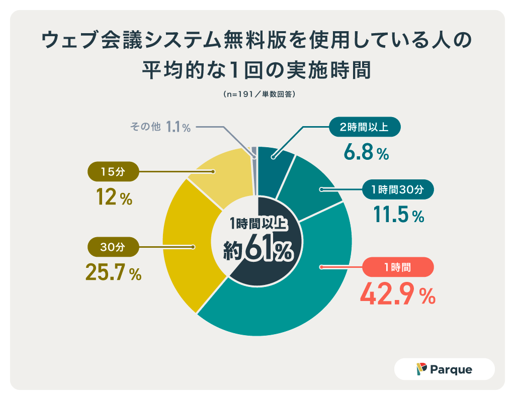 無料版のウェブ会議システムを使用している人に、平均的な1回の実施時間をたずねたところ、「1時間(42.9%)」が最多、次いで「30分(25.7%)」「15分(12%)」という結果になりました。