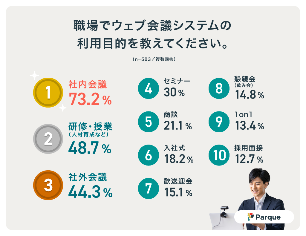 職場でウェブ会議システムを使用している20~60代の男女583人に、「ウェブ会議システムの利用目的」をたずねたところ、1位「社内会議(73.2%)」、2位「研修・授業(48,7%)」、3位「社外会議(44.3%)」という結果となりました。