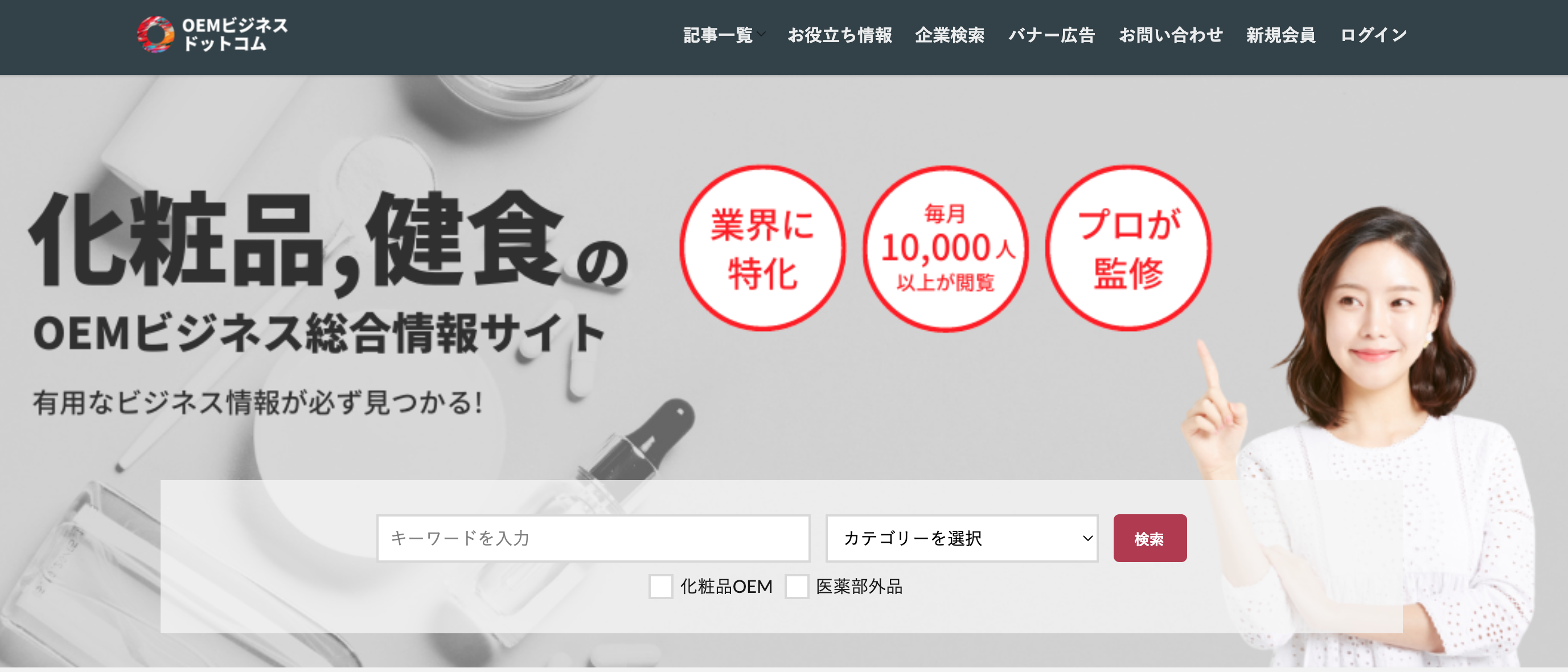 OEMビジネスドットコム。化粧品OEM、健康食品OEMに関わる情報をデザインを一新、随時追加掲載。広告サービスも拡充