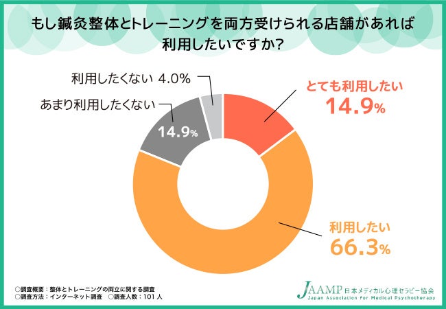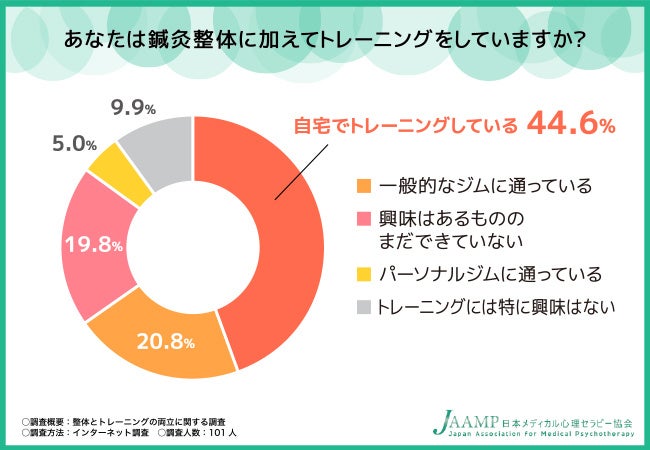 そこで今回、整体セラピスト資格認定試験(https://www.domap.net/biyo/seitai/)を主催する日本メディカル心理セラピー協会(https://www.domap.net/)は、全国20〜60代の男女101名を対象に「整体とトレーニング」に関する調査を実施しました。