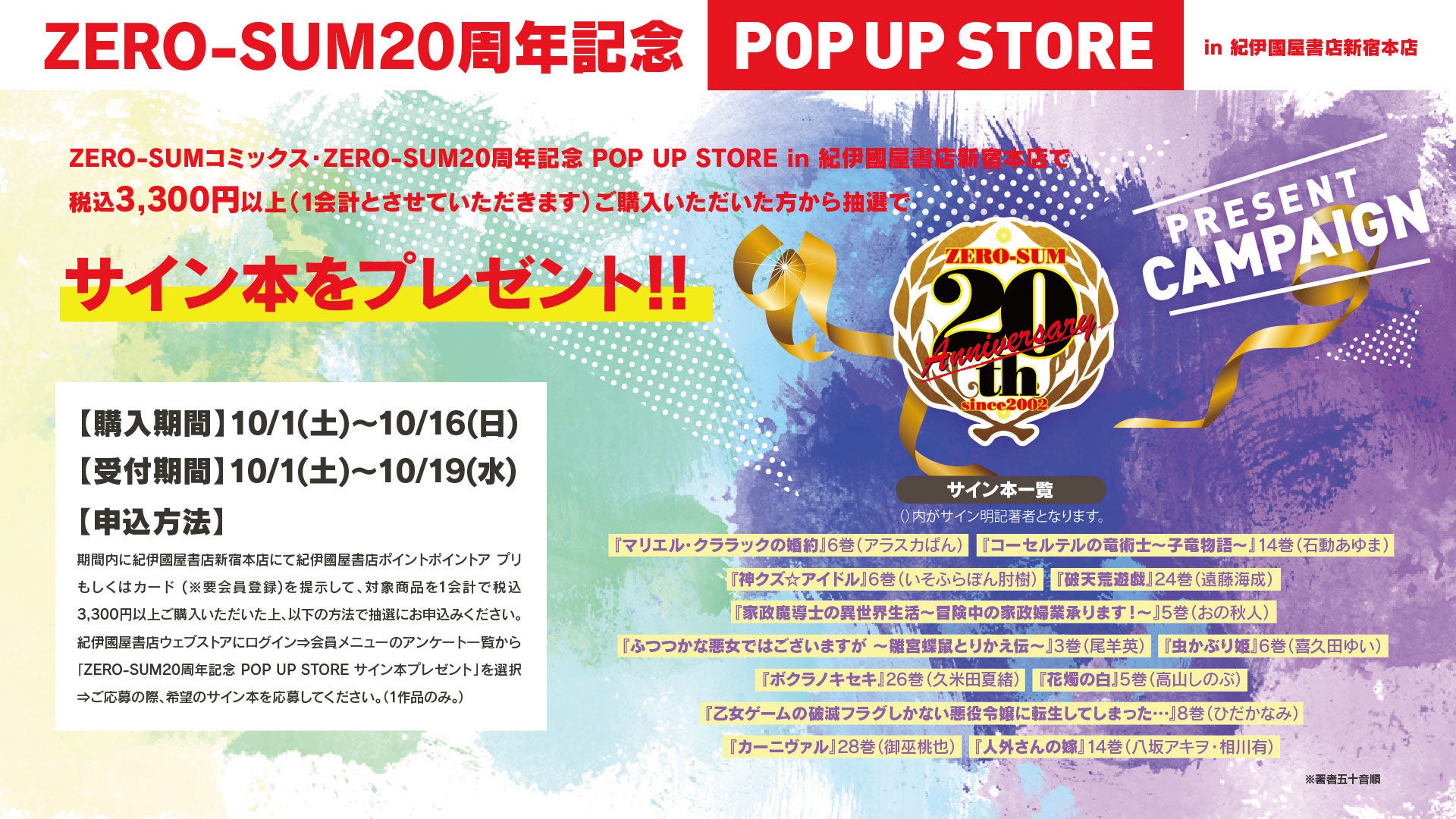 10/1(土)~10/16(日)の期間、紀伊國屋書店新宿本店1Fにて『月刊comicZEROSUM』20周年を記念して開催決定!!