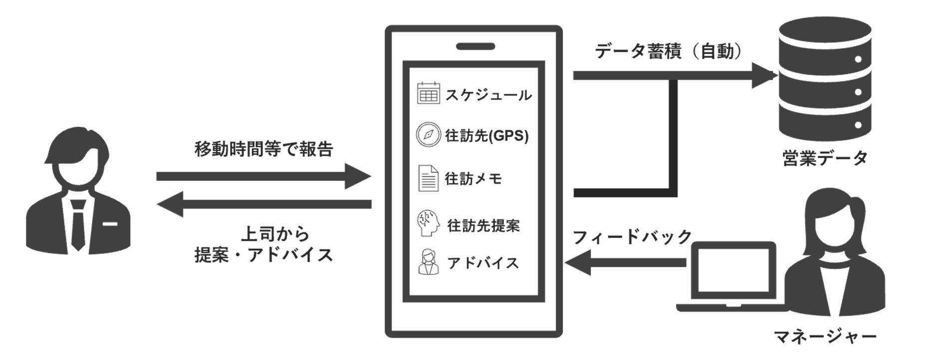 Vymoアプリではすべての契約にかかる営業活動を記録します。記録されたすべての営業プロセスを分析することで成約率の高いハイパフォーマーの営業行動の把握による基本行動の定着や、活動データをもとにした上司から部下へのフィードバック・支援が可能になります。データ入力負荷の軽減