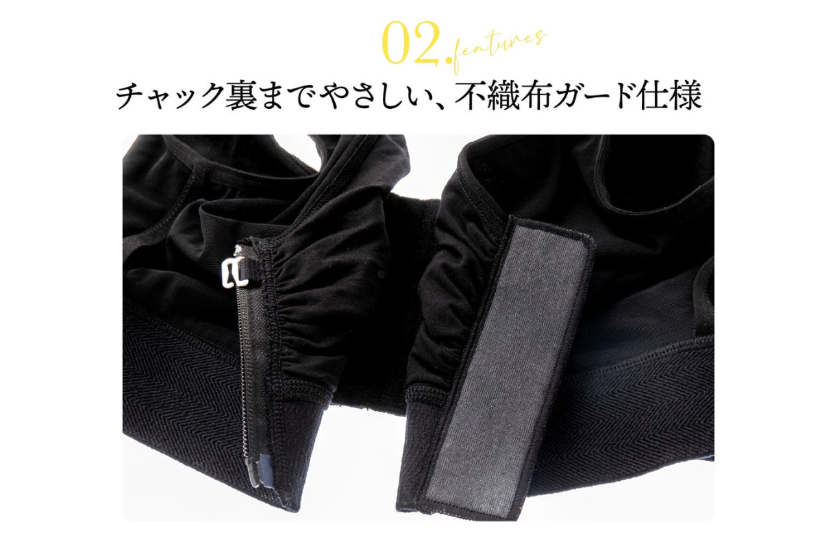 ファスナー裏には不織布ガードを配置し、金具が素肌に素肌やバス地に直接触れにくい安心仕様に。
