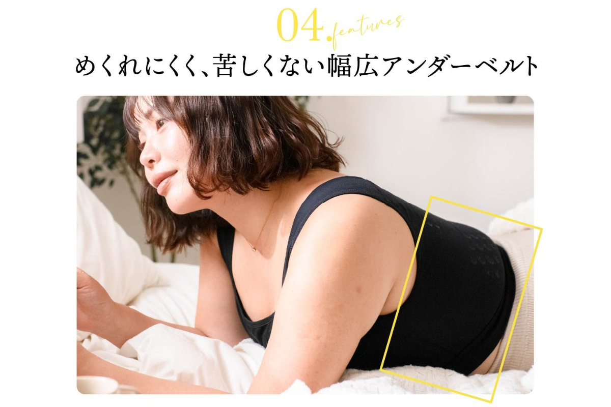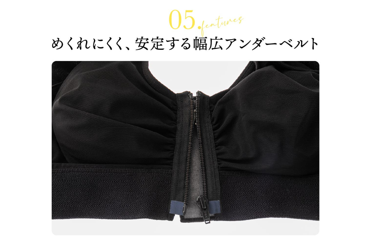 幅広アンダーベルトがめくれにくく、下から“面で支える”ことで胸の重みが肩に集まりにくい設計です。垂れの不安も和らげてくれます。