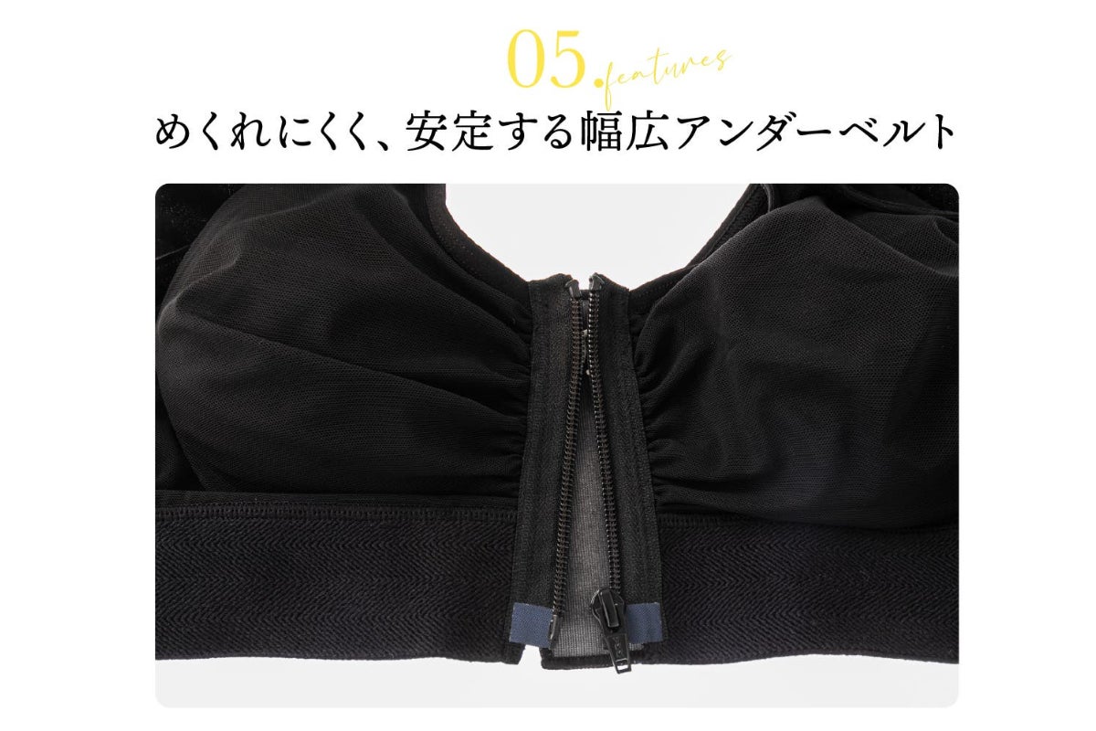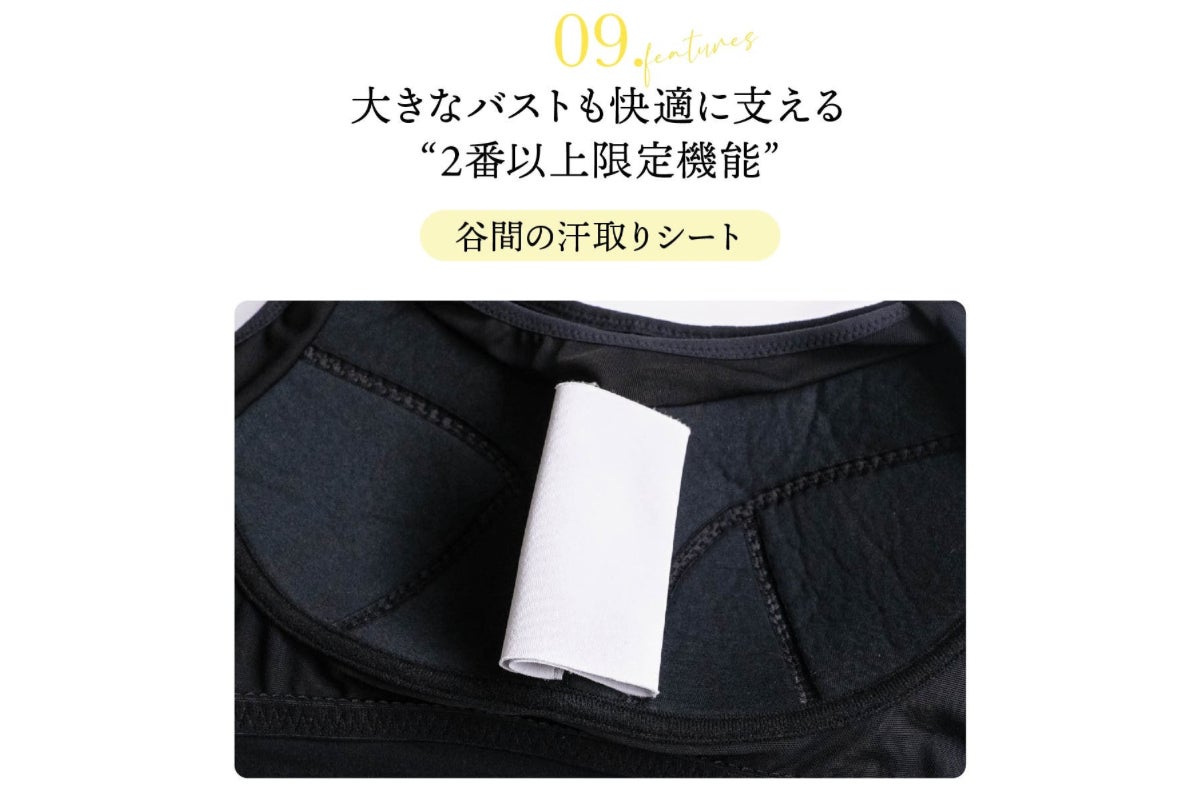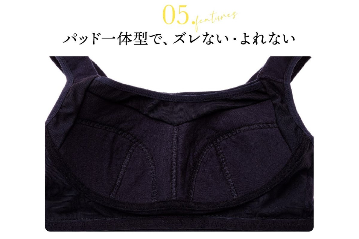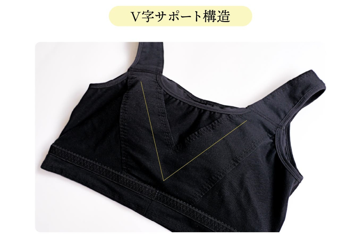 バストの重みで起きやすい“前への倒れ込み”を抑えるため、生地全体で重みを受けとめるV字サポートパネル を内蔵。前に引っ張られる不快感を抑えつつ、しっかり支えられている感覚を得やすい構造に。